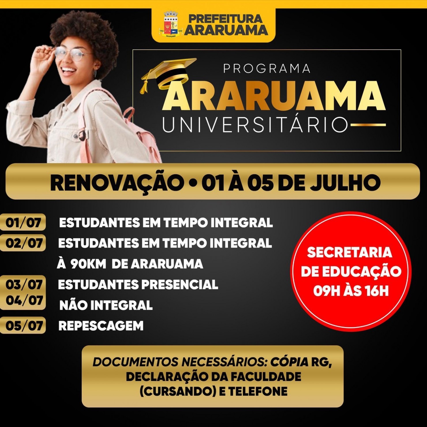 O aluno deve apresentar: cópia do RG, declaração da faculdade (cursando) e telefone.