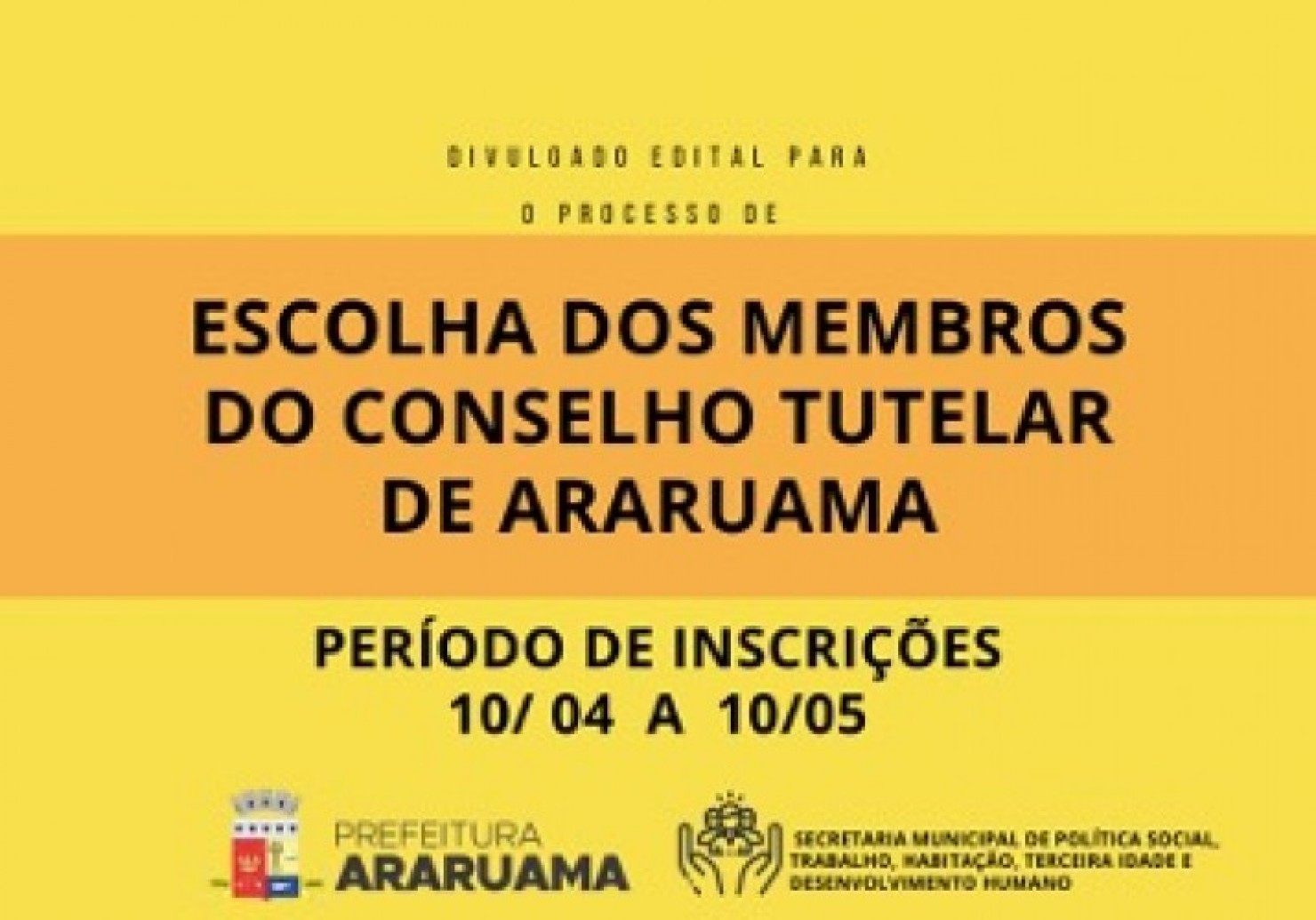 O Conselho Municipal dos Direitos da Criança e do Adolescente de Araruama (CMDCAA ), divulgou o Edital referente ao Processo de Escolha dos Membros do Conselho Tutelar . As inscrições encontram-se abertas de 10 de abril a 10 de maio de 2023 , na sede do CMDCAA que fica na Secretaria Municipal de Política Social, Trabalho, Terceira Idade e Desenvolvimento Humano. O Edital encontra-se no site da Prefeitura de Araruama, acesse o link