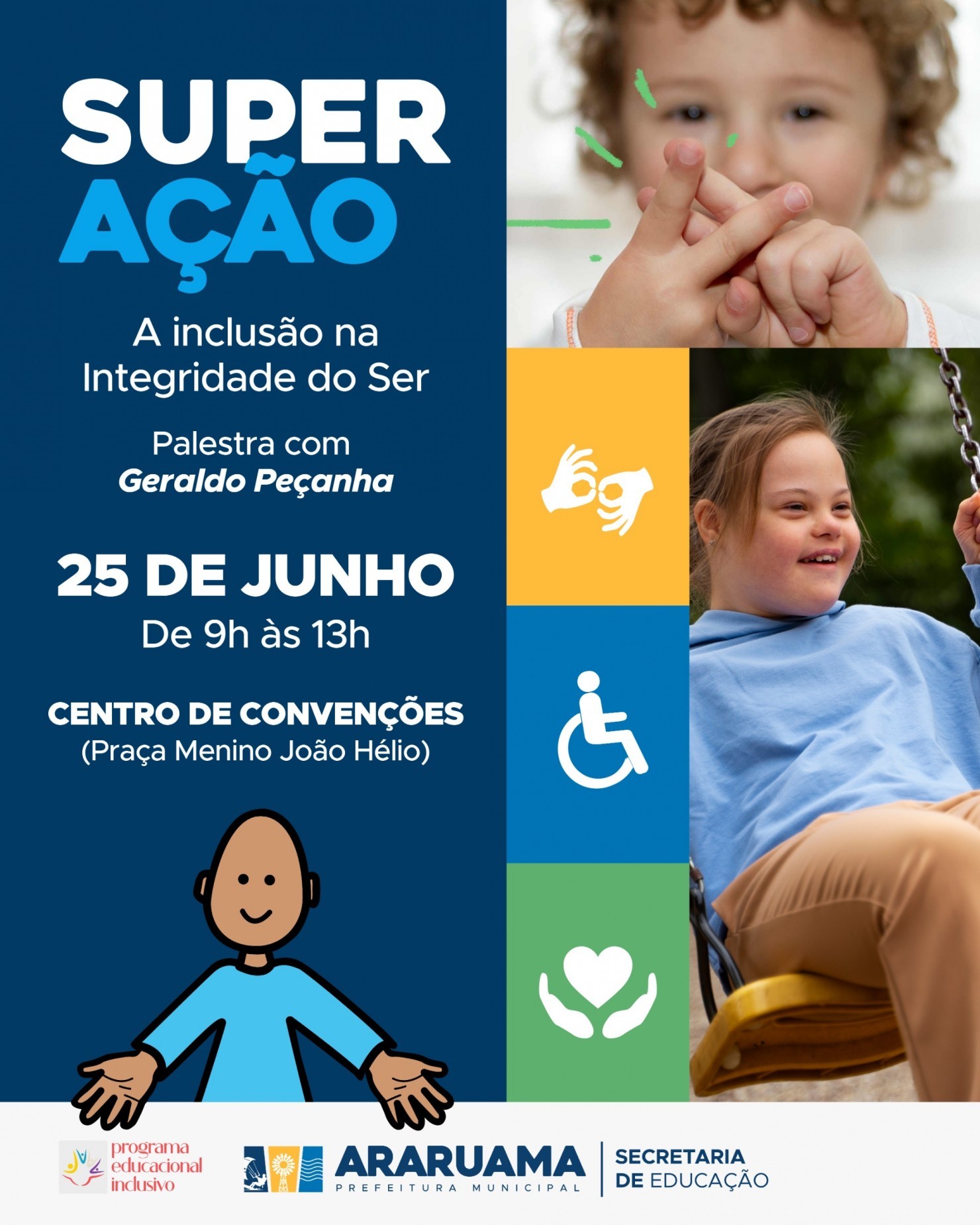 No próximo dia 25 de junho, Araruama será palco de uma importante ação voltada à educação inclusiva. A palestra “Super Ação – A Inclusão na Integridade do Ser”, com o renomado educador e especialista em Educação Geraldo Peçanha, será realizada das 8h às 12h no Centro de Convenções, localizado na Praça Menino João Hélio, no Centro da cidade.