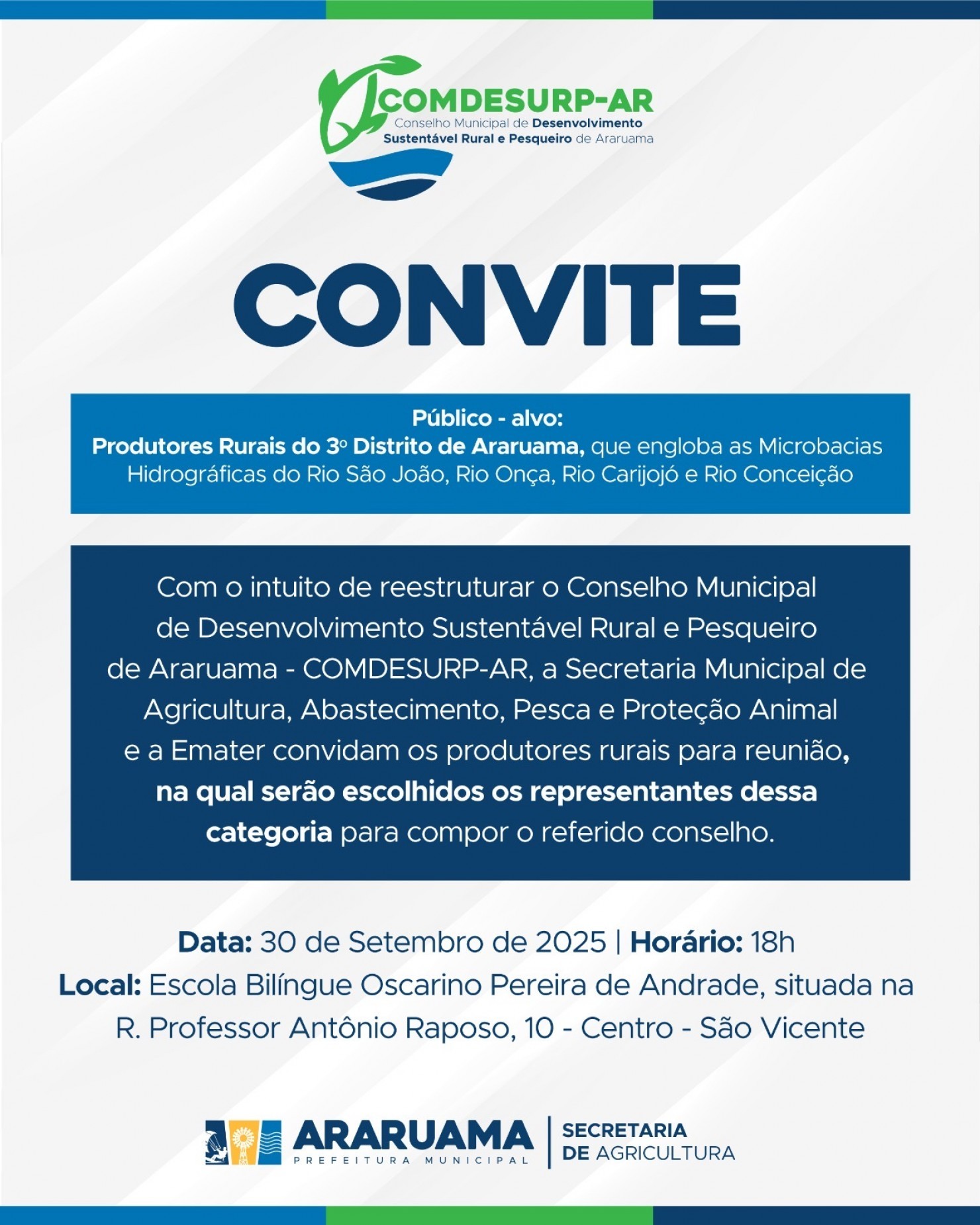A Prefeitura de Araruama, por meio da Secretaria Municipal de Agricultura, Abastecimento, Pesca e Proteção Animal, e a Emater convidam os produtores rurais do terceiro distrito de Araruama, São Vicente, para uma importante reunião, onde serão escolhidos os novos representantes do Conselho Municipal de Desenvolvimento Sustentável Rural e Pesqueiro de Araruama. O encontro será realizado no dia 30 de setembro, às 18h, na Escola Bilíngue Oscarino Pereira de Andrade, localizada na Rua Professor Antônio Raposo, nº 10, no Centro de São Vicente.