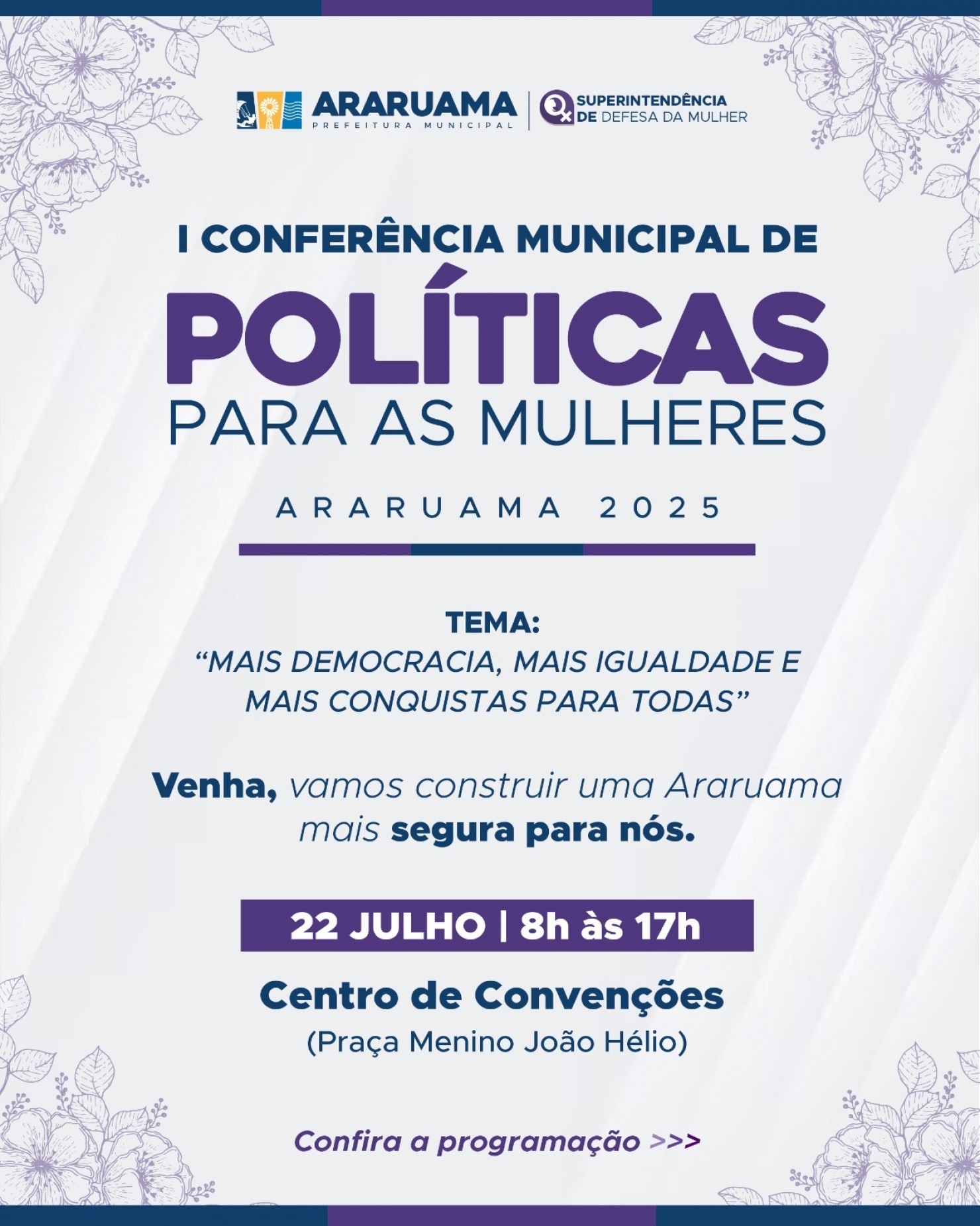 Com o tema “Mais democracia. Mais igualdade e mais conquistas para todas”, o evento é uma realização da Prefeitura de Araruama, por meio da Superintendência de Defesa da Mulher, e reunirá especialistas, autoridades, representantes da sociedade civil e lideranças femininas para debater temas essenciais relacionados à vida e aos direitos das mulheres.
