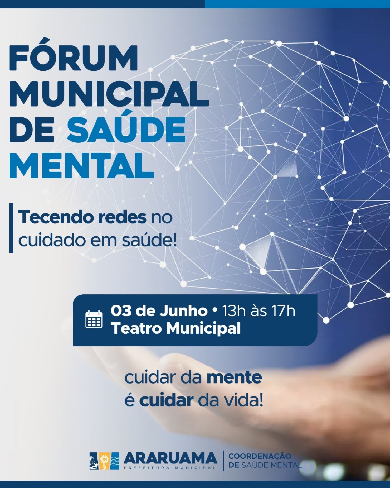 Com o compromisso de fortalecer práticas humanizadas, intersetoriais e antimanicomiais, a Prefeitura de Araruama, por meio da Divisão de Saúde Mental da Secretaria Municipal de Saúde, promove no dia 3 de junho, das 13h às 17h, no Teatro Municipal, o V Fórum de Saúde Mental – Tecendo Redes no Cuidado em Saúde.