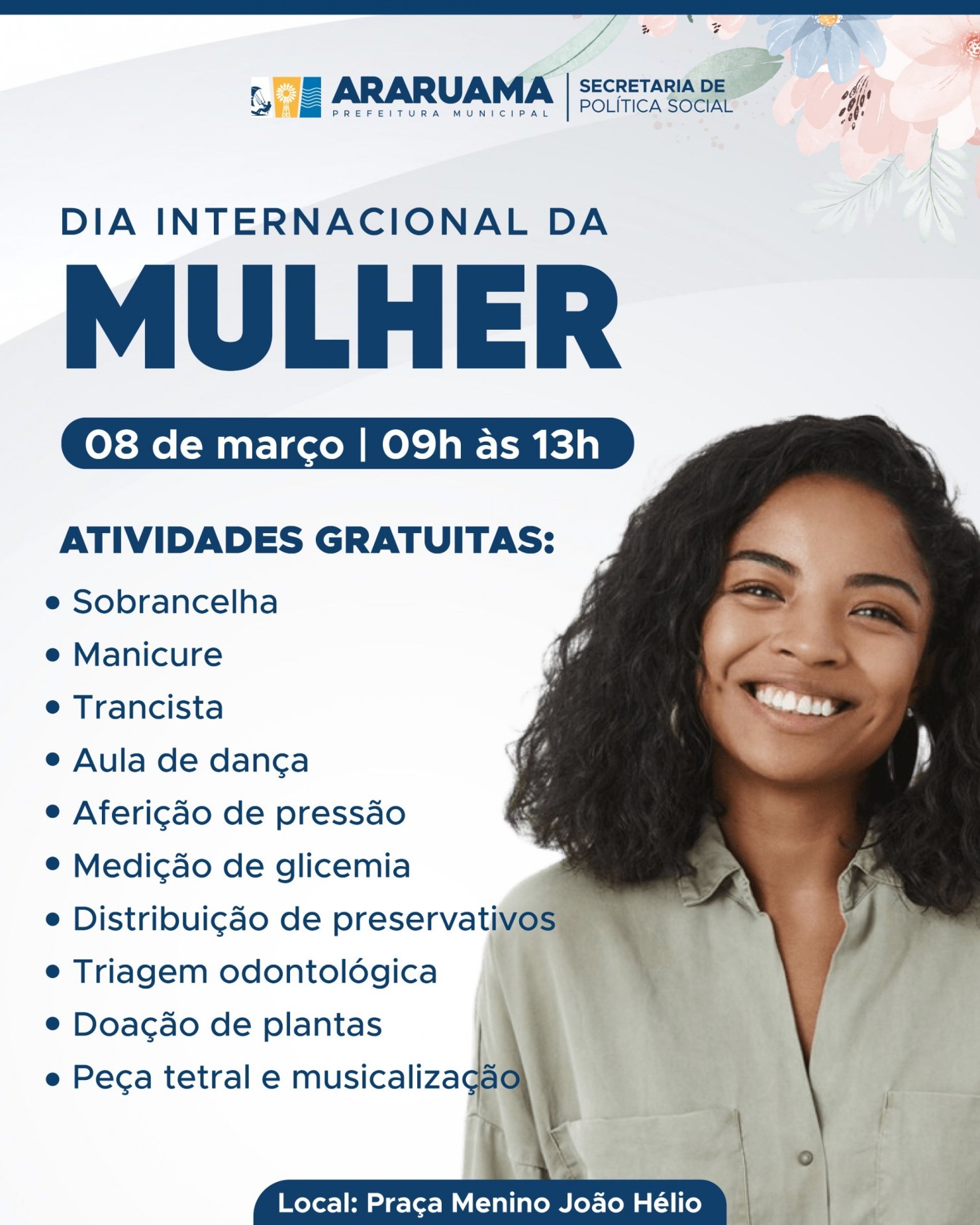 A Prefeitura de Araruama, através da Secretaria Municipal de Política Social, Trabalho e Habitação, Terceira Idade e Desenvolvimento Humano, realizará uma programação especial no Dia Internacional da Mulher, neste sábado (8).