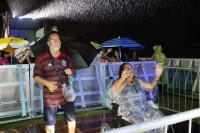 No outro lado, também encostada na grade, a estudante Brenda Costa, de 18 anos, também não se deixou intimidar pelo tempo fechado. Ao lado do amigo Caio Medeiros, de 20, ela resumiu o sentimento do público presente com bom humor: “O Mumuzinho merece! E vale a gente sair de casa mesmo debaixo de chuva pra ser feliz”.