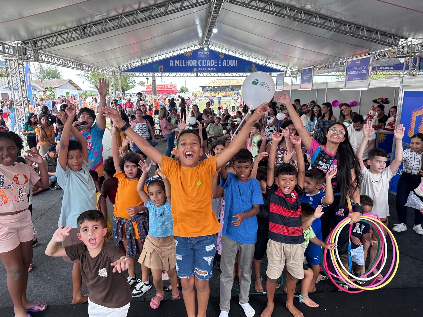 Uma das atrações de maior sucesso entre a criançada foi a Turma da Tia Carol, que transformou a tenda infantil em um grande palco de sorrisos. Os pais também entraram na brincadeira, tornando o ambiente ainda mais alegre e acolhedor.