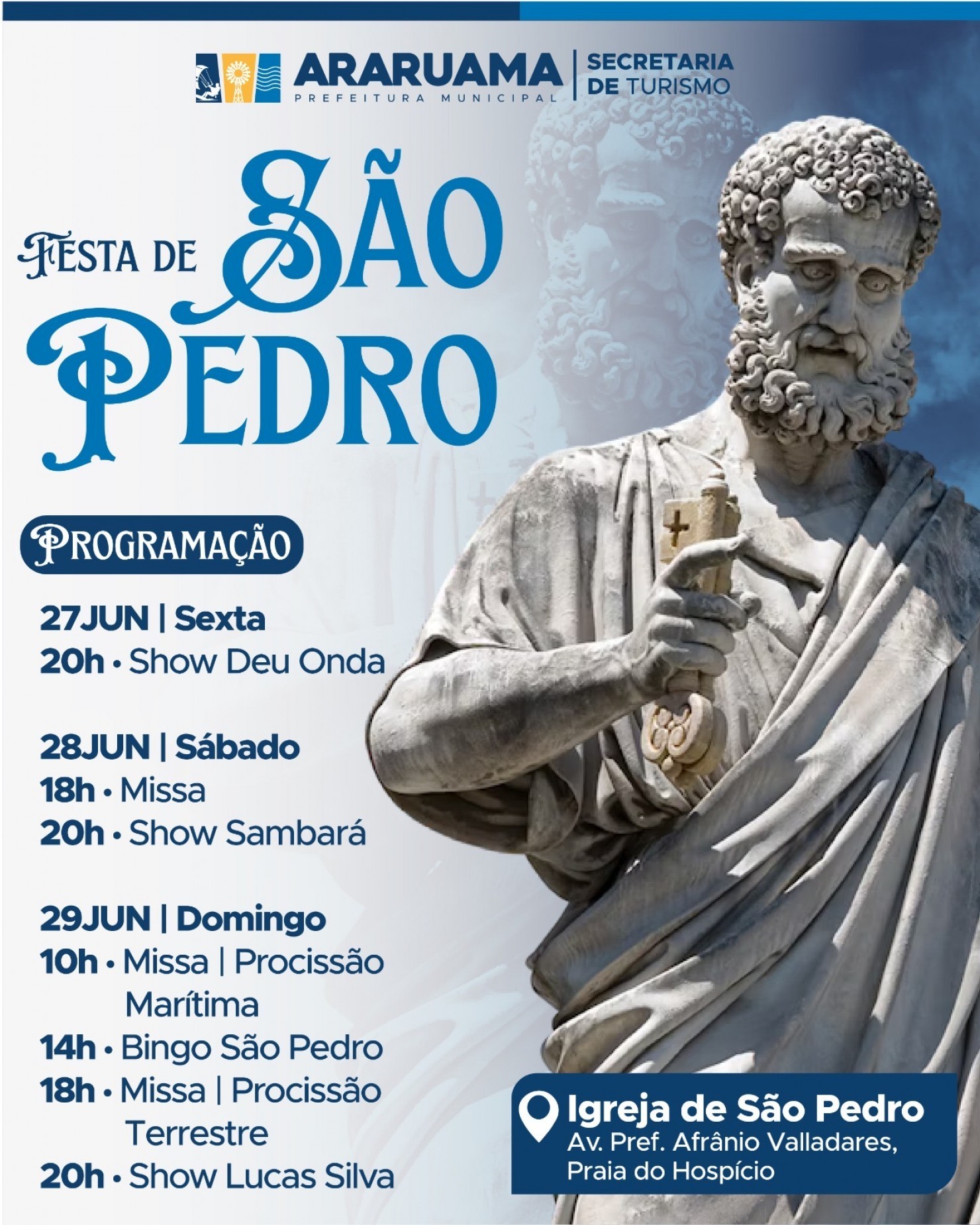 Entre os dias 27 e 29 de junho, Araruama realiza uma das celebrações religiosas mais tradicionais do município: a Festa de São Pedro, padroeiro dos pescadores. Promovido pela Igreja de São Pedro, com apoio da Prefeitura de Araruama, por meio da Secretaria de Turismo e Desenvolvimento Econômico, o evento acontece na Praia do Hospício, reunindo manifestações de fé, atrações culturais e shows gratuitos abertos ao público.