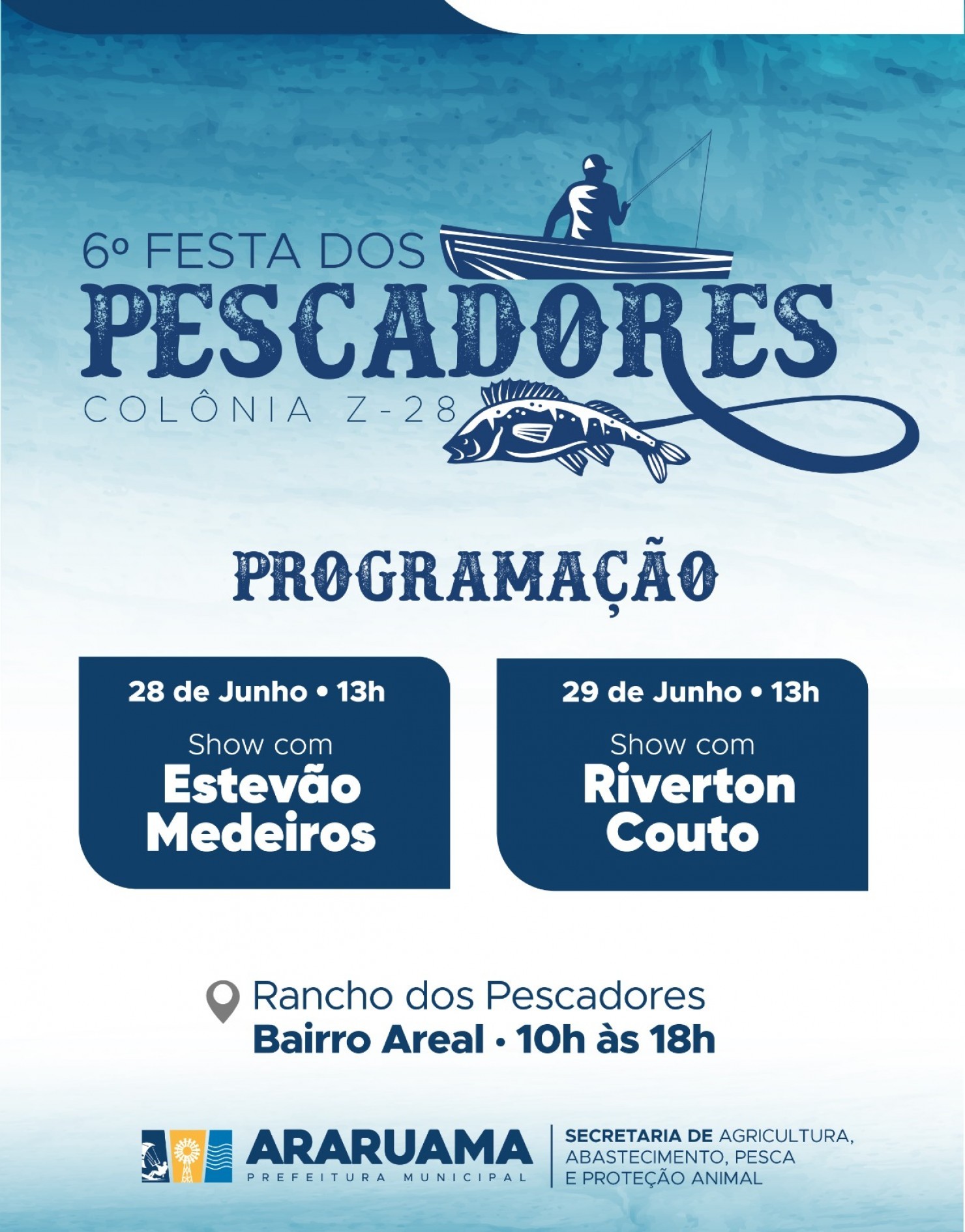A tradicional Festa dos Pescadores de Araruama chega à sua sexta edição celebrando a cultura, a fé e o ofício de quem vive da pesca artesanal. Realizado pela Prefeitura de Araruama, por meio da Secretaria de Agricultura, Abastecimento, Pesca e Proteção Animal, o evento acontece nos dias 28 e 29 de junho, no Rancho dos Pescadores, localizado na Colônia Z-28, em Areal. O evento promete atrair moradores e turistas com uma programação musical especial e uma variedade de atrações culturais.