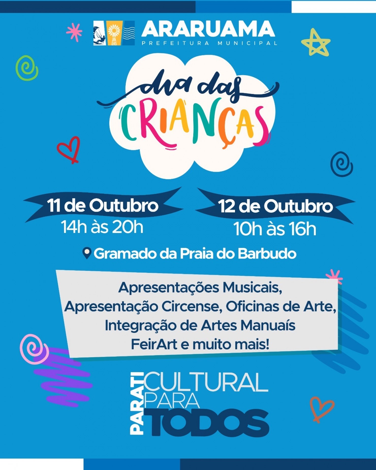 A Prefeitura de Araruama preparou uma programação especial para celebrar o Dia das Crianças com muita arte, música e alegria. O evento “Parati Cultura Para Todos – Fim de Semana das Crianças” acontece no gramado da Praia do Barbudo, no bairro Parati, e promete encantar toda a família.