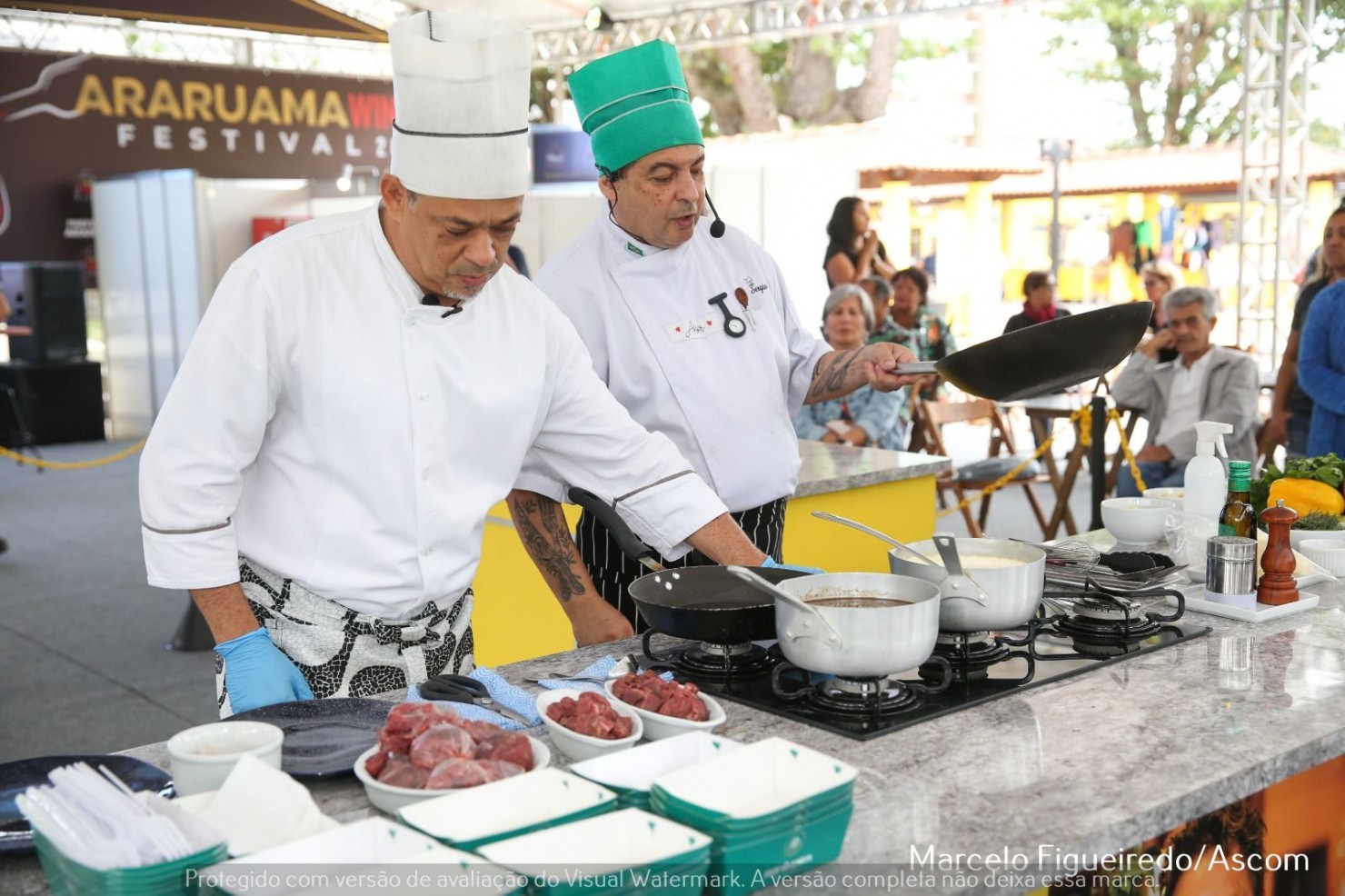 Da palestra seguimos direto para a aula show de gastronomia ao vivo com os chefes Sérgio Lima e Marquesy Campos, do restaurante Flor da Lagoa,