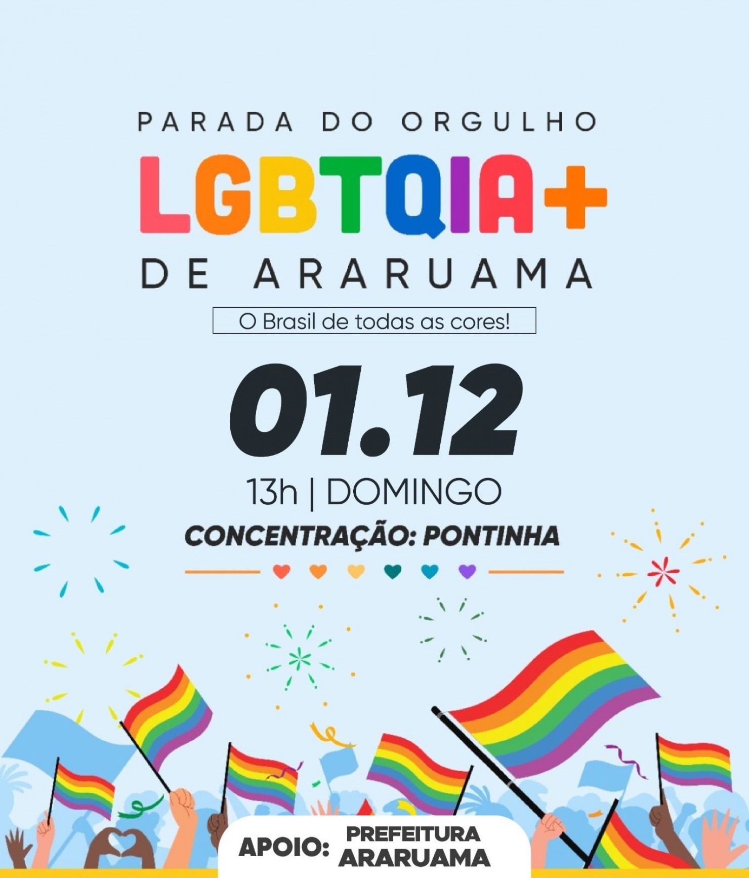 A tradicional Parada do Orgulho LGBTQIA+ de Araruama será realizada no dia 01 de dezembro (domingo), a partir das 13h, com concentração na Pontinha.