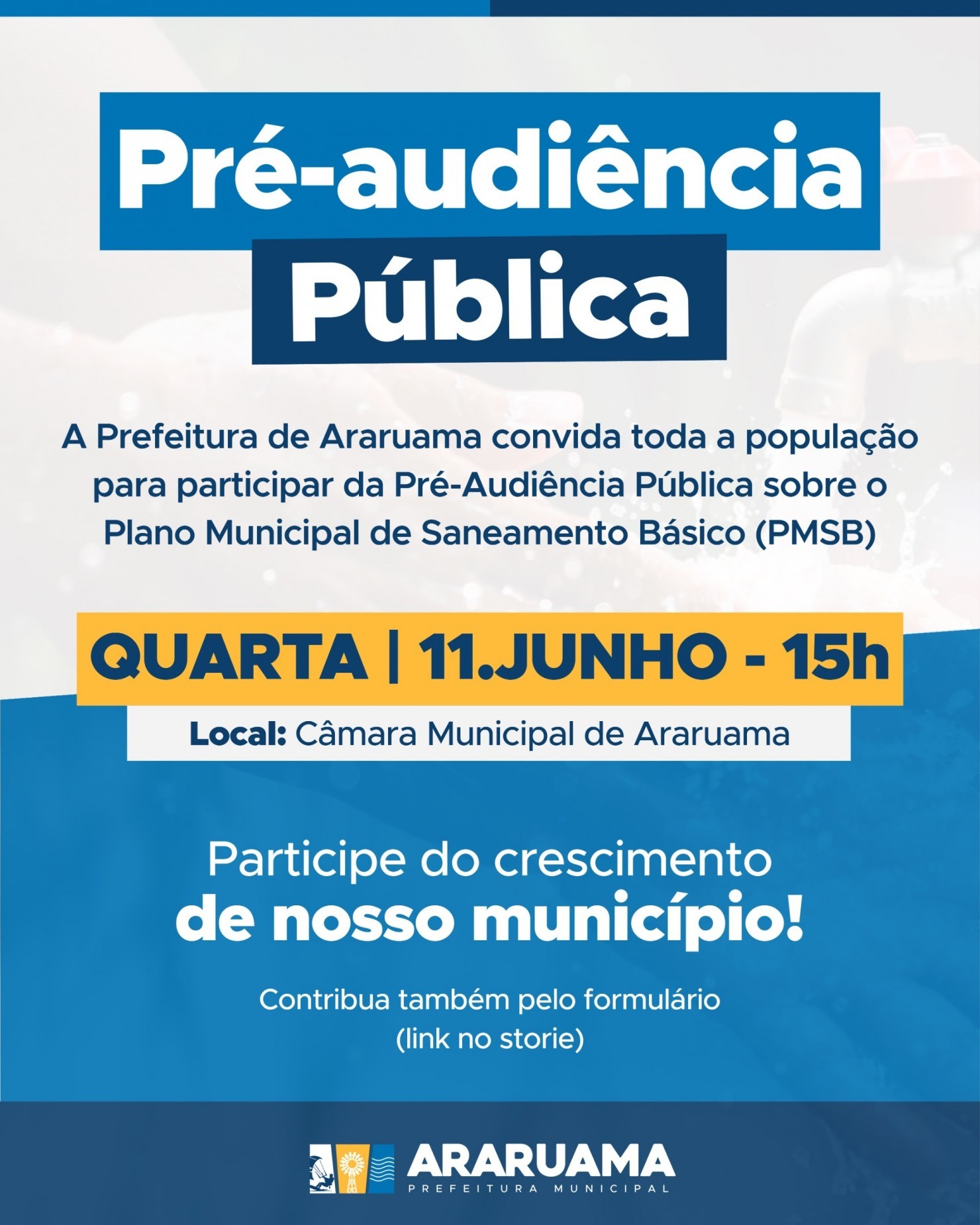 Visando a revisão do Plano Municipal de Saneamento Básico (PMSB), referente as prestações dos serviços públicos de abastecimento de água potável,esgotamento sanitário, drenagem e manejo das águas pluviais urbanas, e limpeza urbana e manejo de resíduos sólidos, com ampla participação popular, a Prefeitura Municipal de Araruama (RJ) convida toda a sociedade civil e entidades para participarem da Pré-Audiência Pública para aprovação dos Diagnósticos do PMSB.