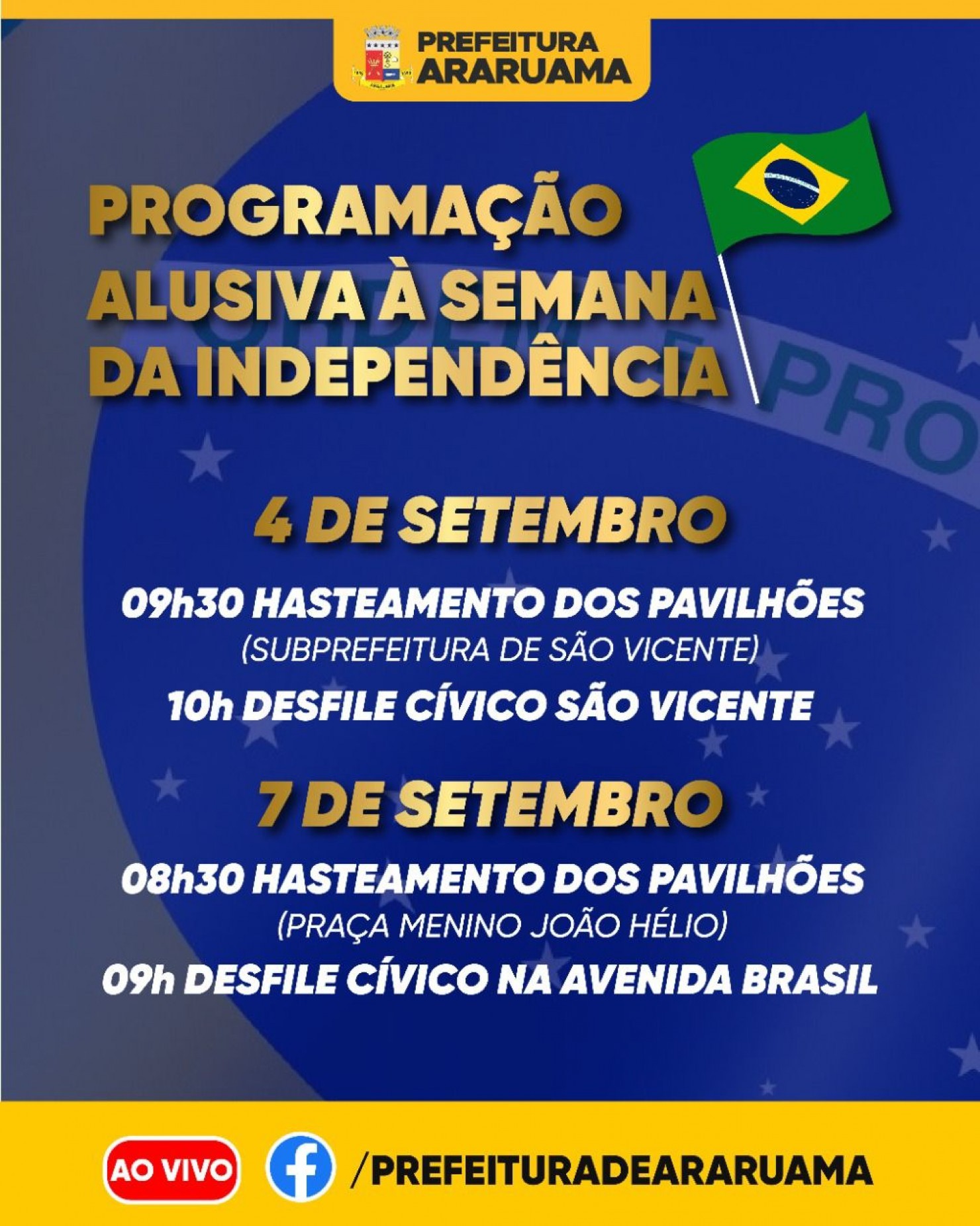 Quem não puder comparecer presencialmente, vai poder acompanhar os eventos da Semana da Independência de maneira on-line, pelo Facebook da Prefeitura de Araruama.