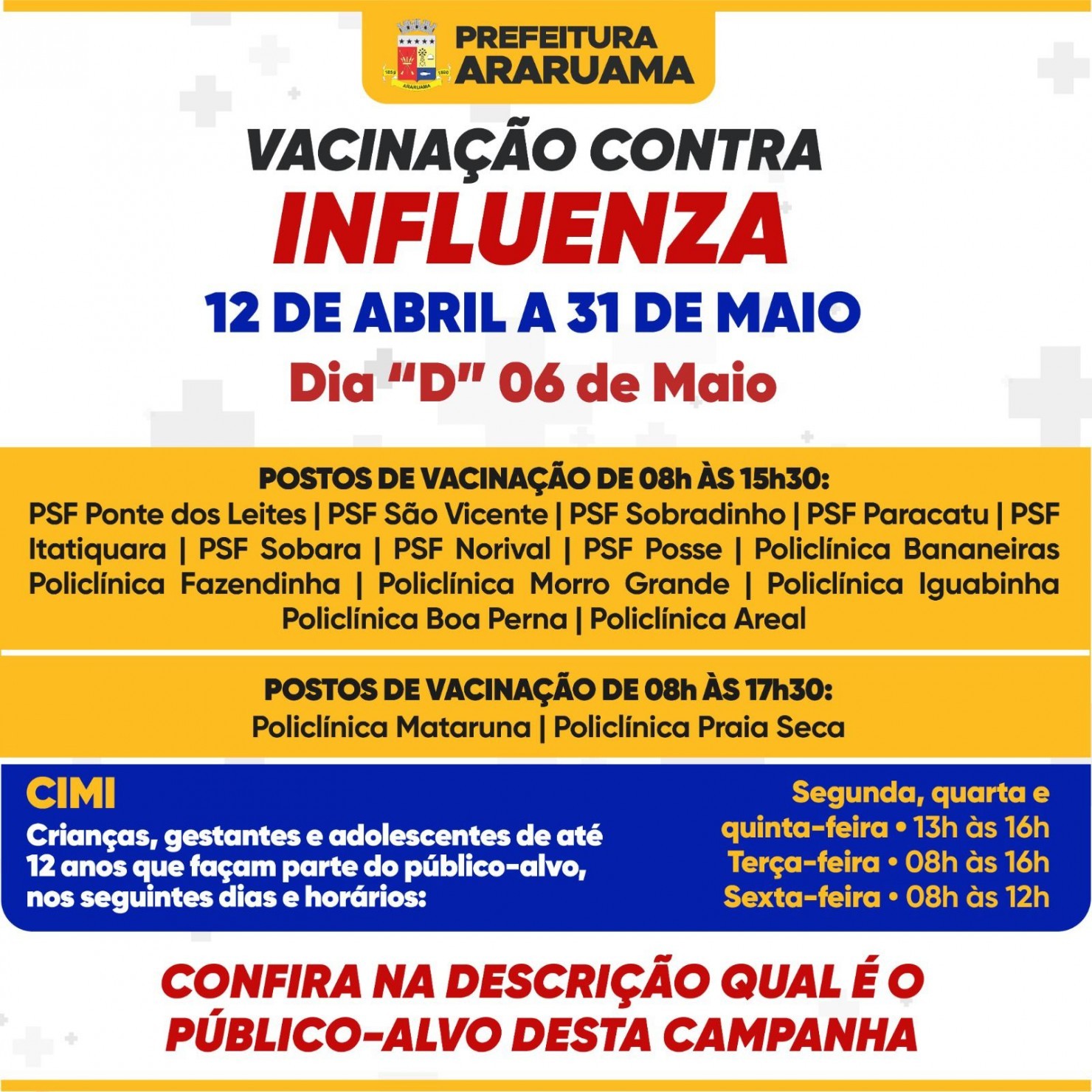 Atenção: também haverá o Dia D da vacinação contra a gripe que será no dia 06 de maio em todas as unidades de saúde citadas acima, no período de 08h às 13h.