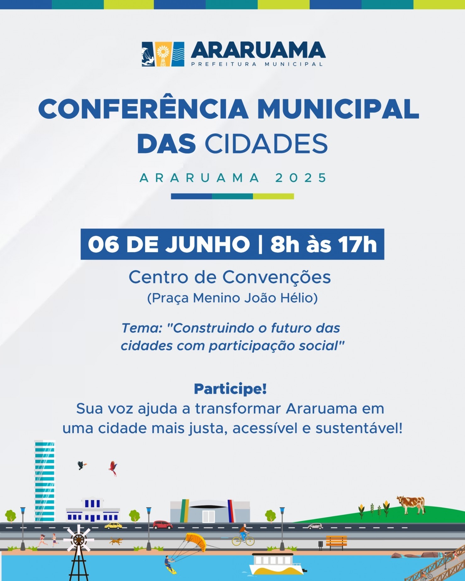 A Prefeitura, por meio da Superintendência Municipal de Planejamento, convida toda a sociedade civil, entidades representativas, conselhos municipais, movimentos sociais, lideranças comunitárias, técnicos e gestores públicos a se fazerem presentes neste importante momento de escuta e planejamento para o futuro de Araruama. A 1ª Conferência Municipal das Cidades será realizada no dia 6 de junho, das 8h às 17h, no Centro de Convenções, na Praça Menino João Hélio.