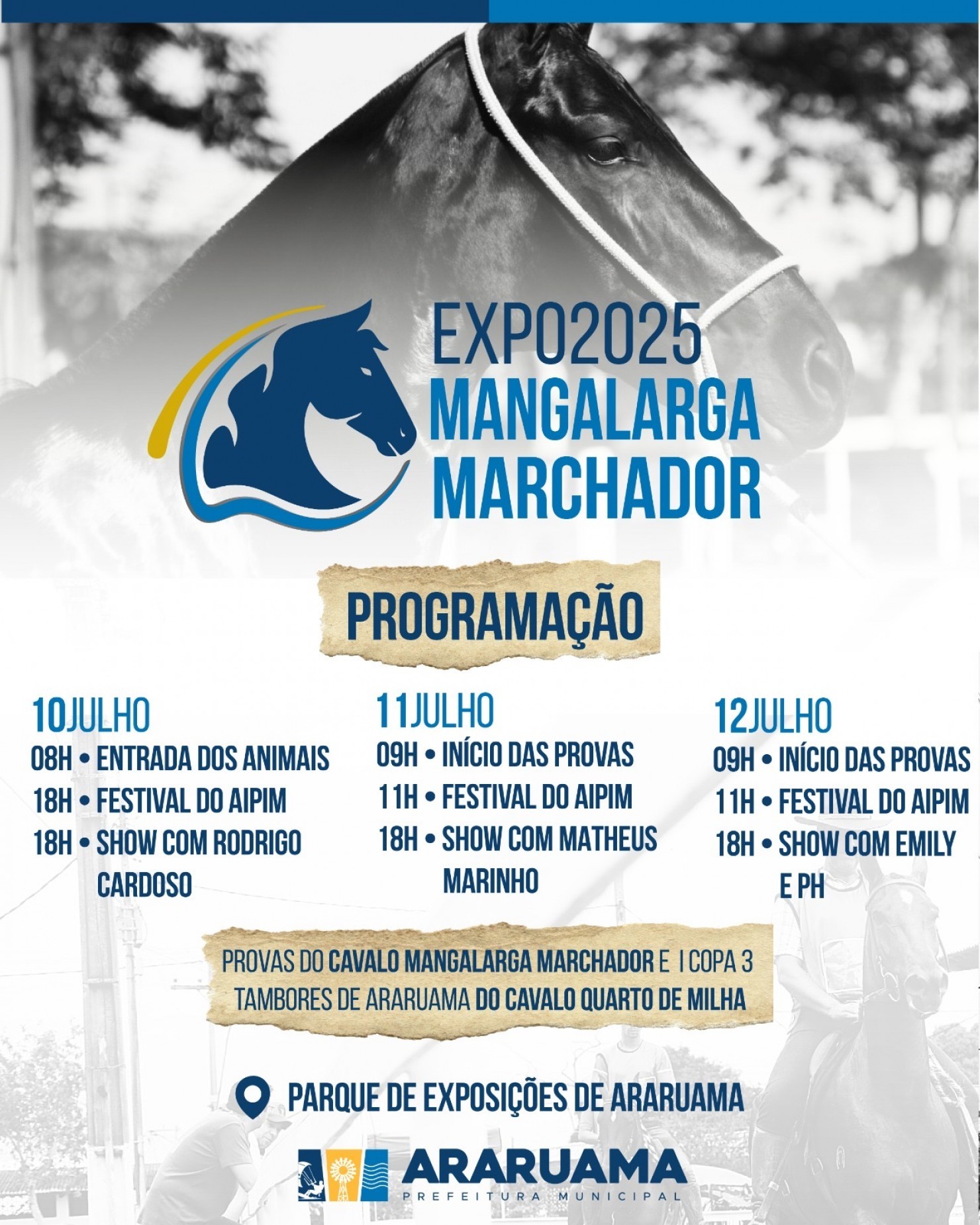A Prefeitura de Araruama vai realizar de 10 a 12 de julho uma grande festa que valoriza as raizes do campo e fomenta a agricultura e a pecuária da região: a Expo 2025 Mangalarga Marchador.
