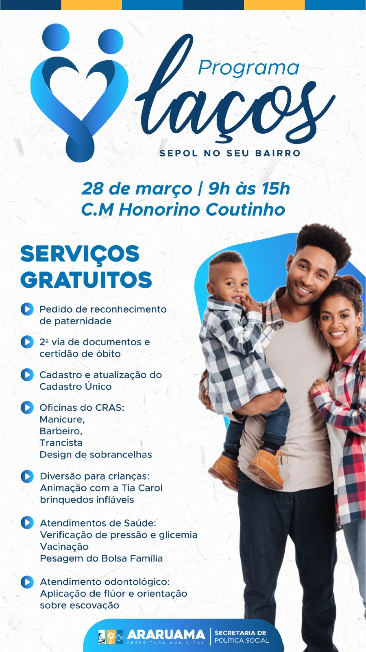 A Prefeitura de Araruama, por meio da Secretaria Municipal de Política Social, Trabalho e Habitação, Terceira Idade e Desenvolvimento Humano, vai realizar a primeira edição do Programa Laços – SEPOL no seu bairro. A ação vai acontecer no dia 28 de março, das 9h às 15h, no Colégio Municipal Honorino Coutinho, no distrito de Morro Grande.