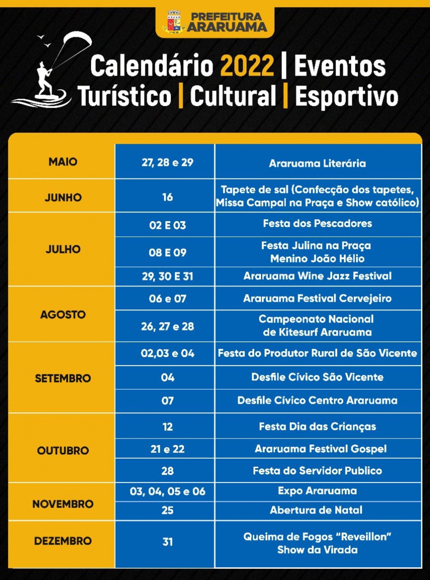 Para acompanhar toda a programação a Prefeitura montou um calendário com os principais eventos, que vão do mês de maio até dezembro, para que a população consiga acompanhar e se preparar para todas as atrações municipais.