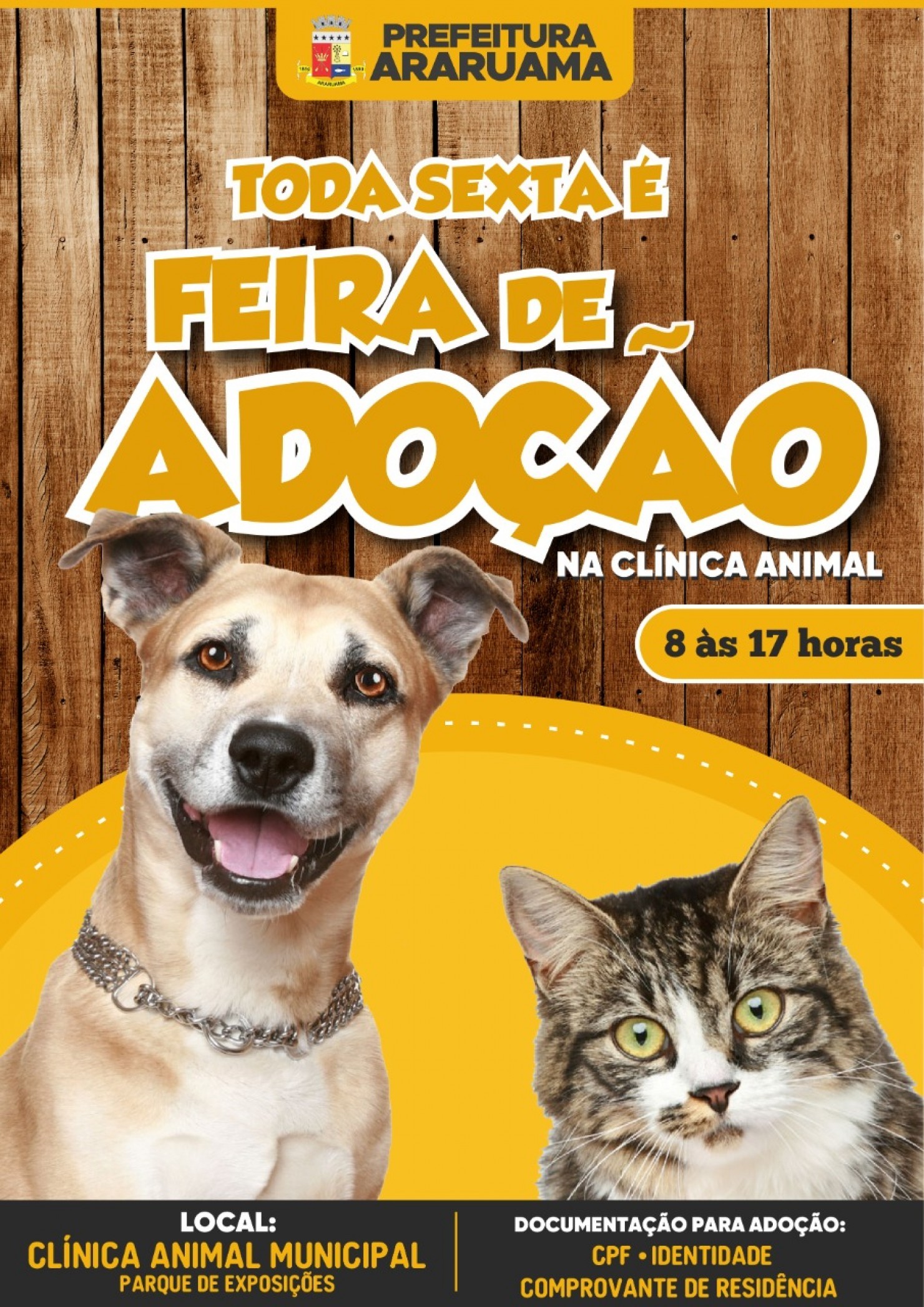 A Prefeitura de Araruama, por meio da Secretaria de Ambiente, Agricultura, Abastecimento e Pesca, lançou o projeto “Feira de Adoção” de cãezinhos e gatos que foram resgatados das ruas em situação de abandono pela Clínica Animal. Os bichinhos foram tratados, limpos, castrados e vermifugados; e agora estão prontinhos para receber um novo lar.