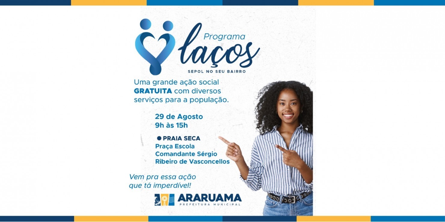 A Prefeitura de Araruama, por meio da Secretaria de Política Social, vai realizar na próxima sexta-feira, 29 de agosto, mais uma edição do Programa Laços – SEPOL no seu Bairro. Desta vez, a ação acontece na Praça Escola Comandante Sérgio Ribeiro de Vasconcellos, em Praia Seca, das 9h às 15h, com uma série de serviços gratuitos voltados para a comunidade.