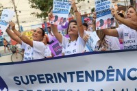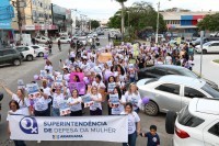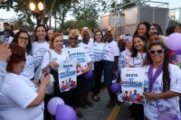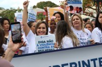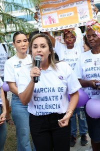 A prefeita Daniela Soares participou do ato, percorrendo as ruas e utilizando o microfone para reforçar a importância do enfrentamento à violência doméstica. Em sua fala, destacou que a luta pela vida e pelo respeito às mulheres deve ser permanente e coletiva.