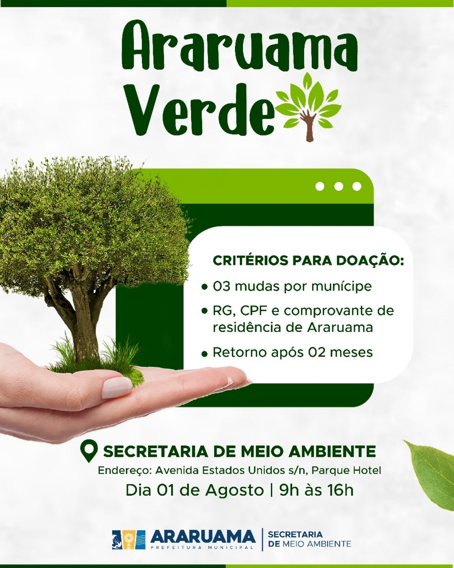 A Prefeitura de Araruama, por meio da Secretaria Municipal de Meio Ambiente, realiza nesta quinta-feira, 01 de agosto, mais uma edição do programa Araruama Verde — uma iniciativa que tem como objetivo incentivar a arborização urbana, a preservação ambiental e a consciência sustentável entre os moradores do município.