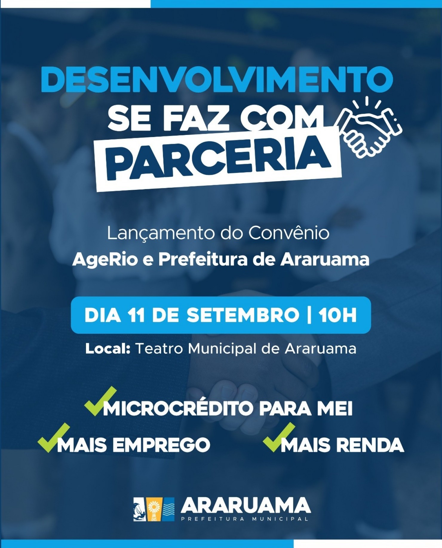 A Prefeitura Municipal de Araruama, através da Secretaria de Turismo e Desenvolvimento Econômico, convida você para o lançamento do convênio com a AgeRio.