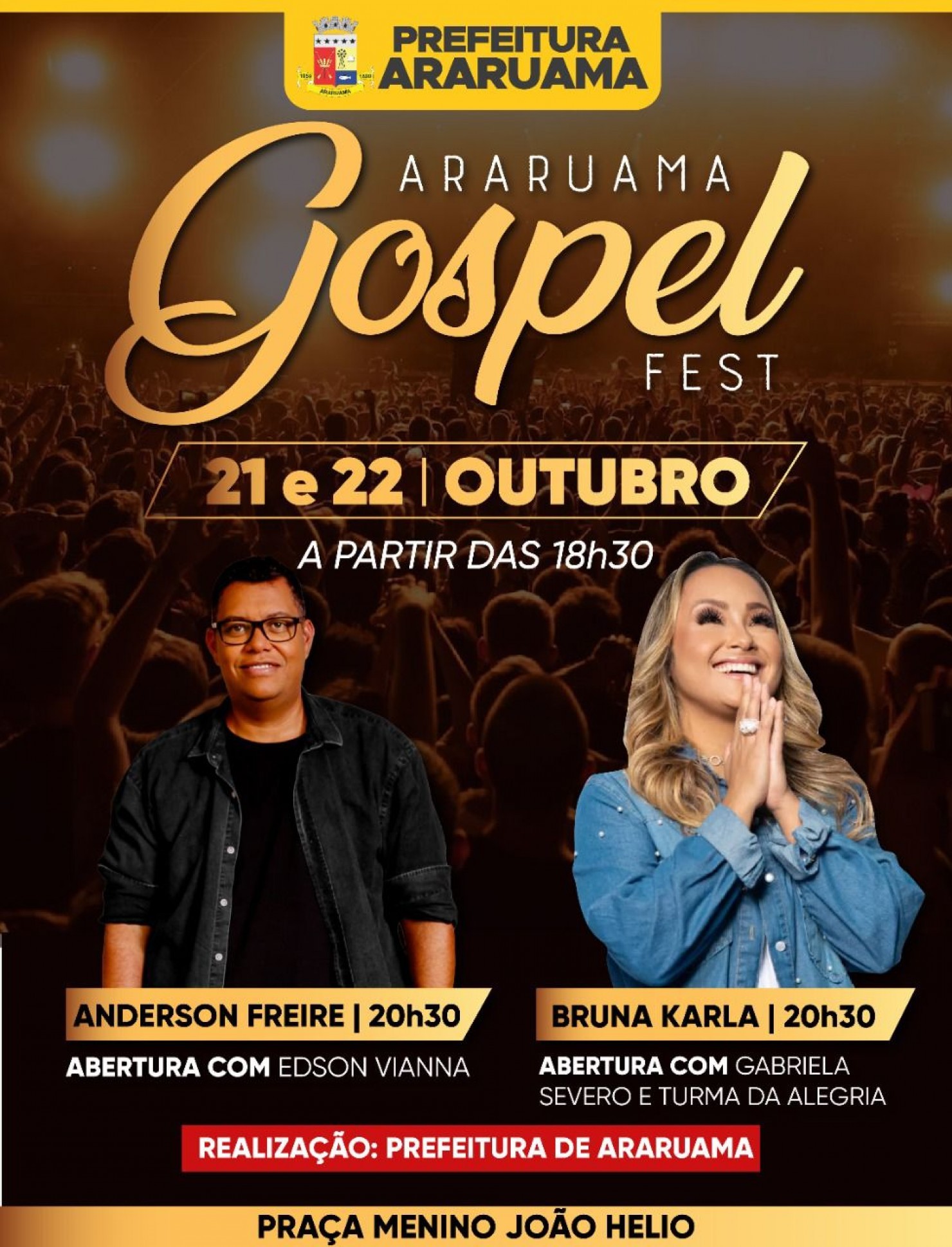 O evento de música gospel (que é um estilo musical religioso de grupos cristãos) vai acontecer nos dias 21 e 22 de outubro, a partir das 18h30, na Praça Menino João Hélio, no Centro.