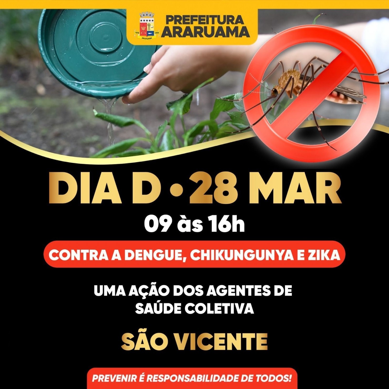 A luta contra o Aedes Aegypti continua em Araruama. A Prefeitura, por meio da Secretaria de Saúde e da Secretaria de Obras , vai realizar mais um Dia D contra a dengue no município. Dessa vez a ação será no distrito de São Vicente, nessa quinta-feira, 28, entre 09h e 16h.