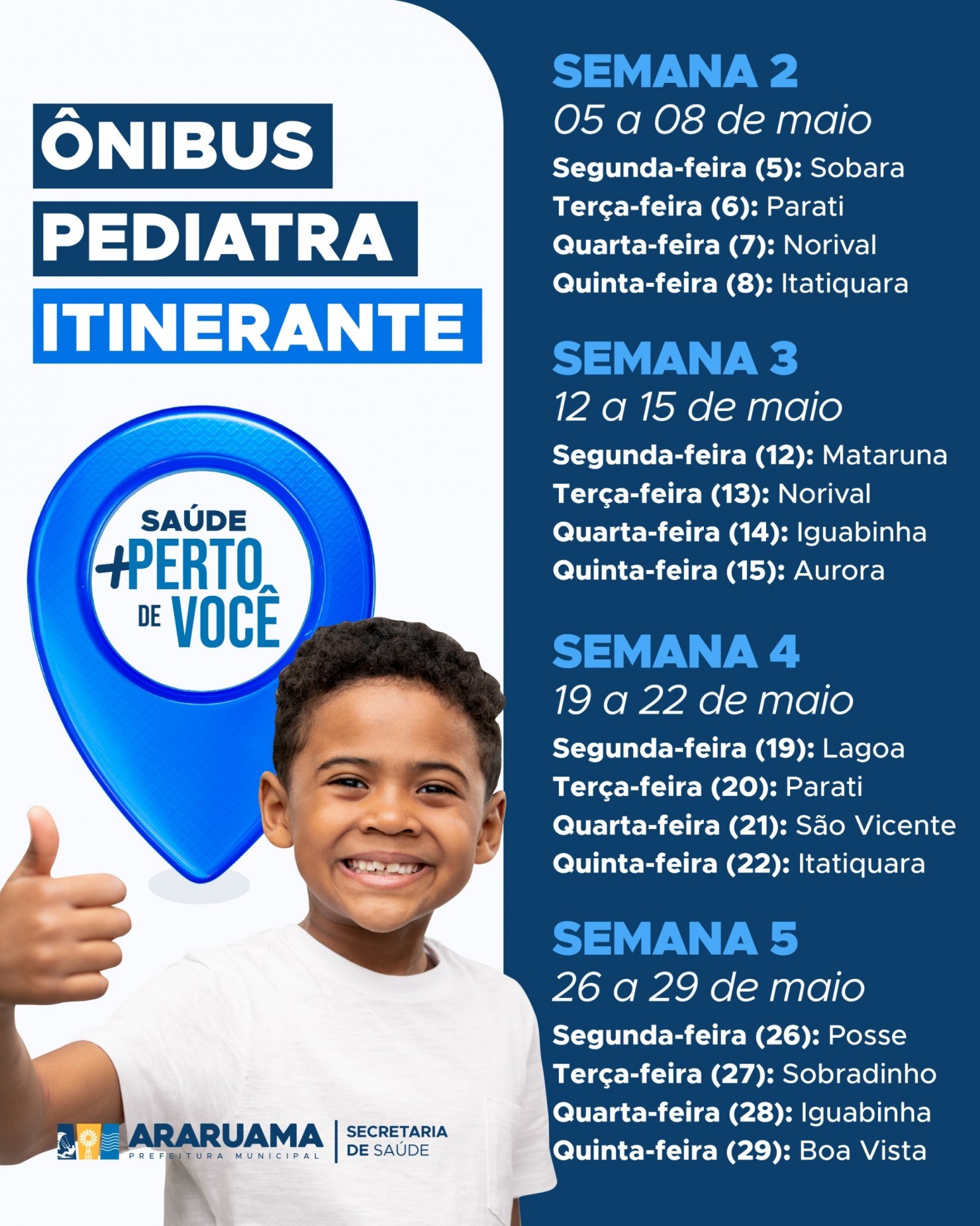 A Prefeitura de Araruama, por meio da Secretaria Municipal de Saúde, divulgou nesta quinta-feira (8) o cronograma de funcionamento do Ônibus Pediátrico no mês de maio, que oferece atendimento médico gratuito às crianças dos bairros do município.