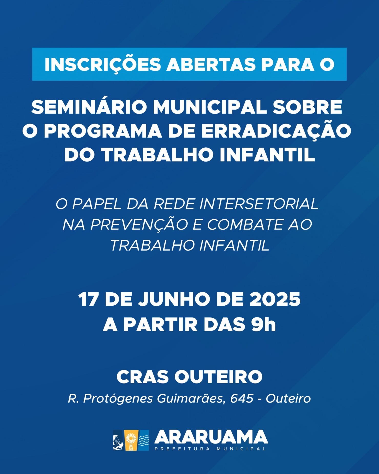 No dia 17 de junho, das 9h às 12h, o CRAS do bairro Outeiro vai receber um seminário essencial para quem atua ou se preocupa com os direitos da infância e adolescência. Com o tema “O papel da rede intersetorial na prevenção e erradicação do trabalho infantil”, o evento é promovido pela Prefeitura, por meio da Secretaria de Política Social, Trabalho, Habitação, Terceira Idade e Desenvolvimento Humano.