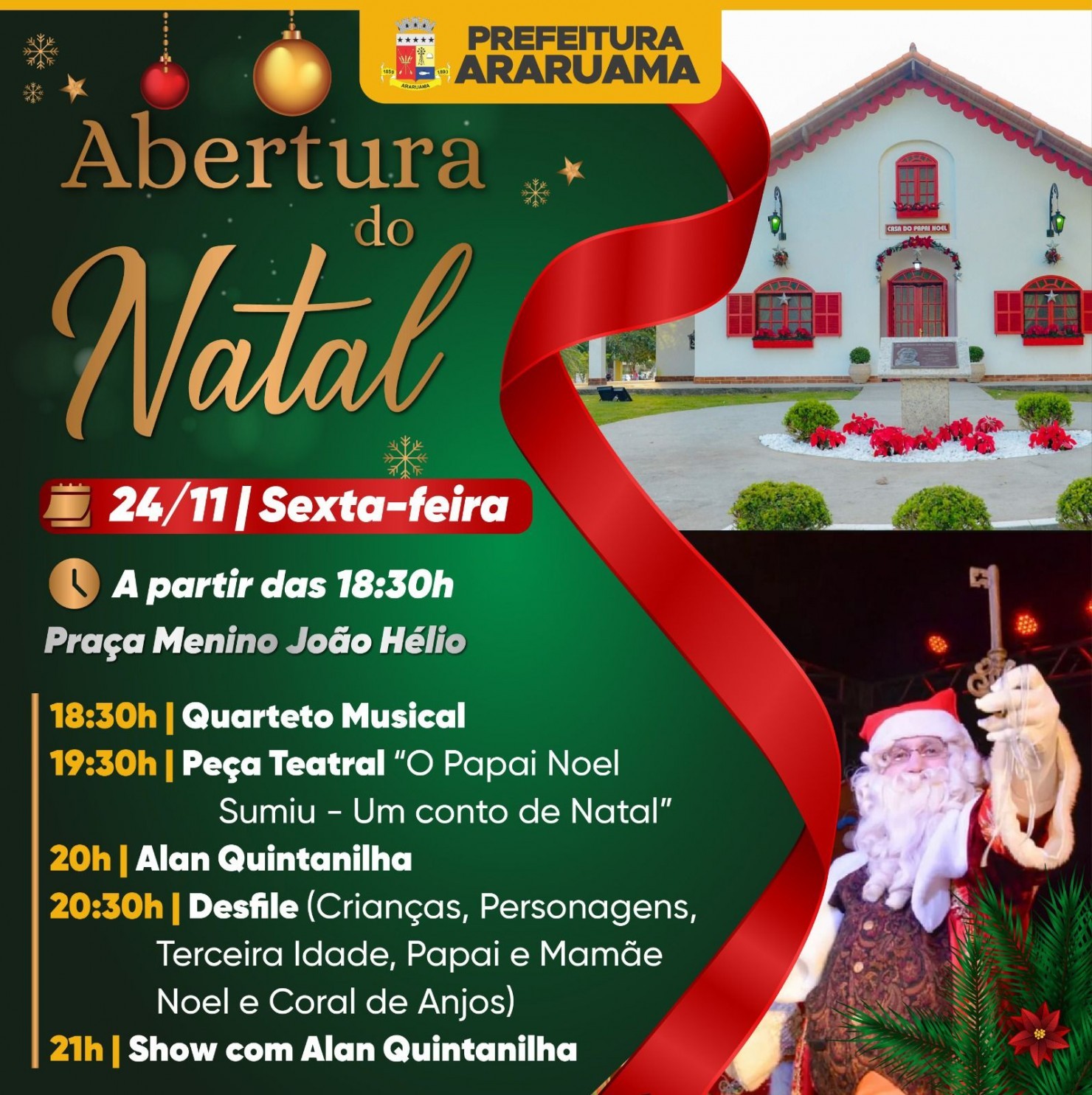 Agora falta pouco! O espírito e a magia natalina vão emocionar a população araruamense. A Abertura do Natal acontece hoje, dia 24, a partir das 18h30, na Praça Menino João Hélio, no Centro.