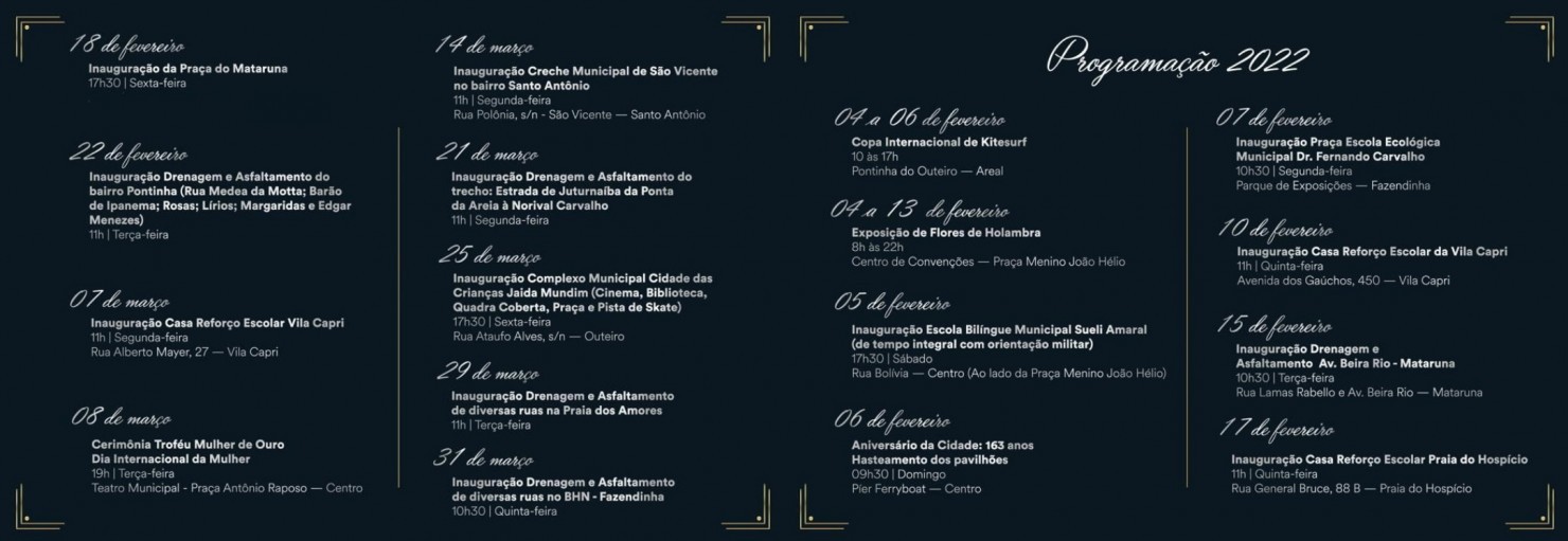São tantos eventos e obras que serão entregues à população, que o calendário só termina no fim de março.