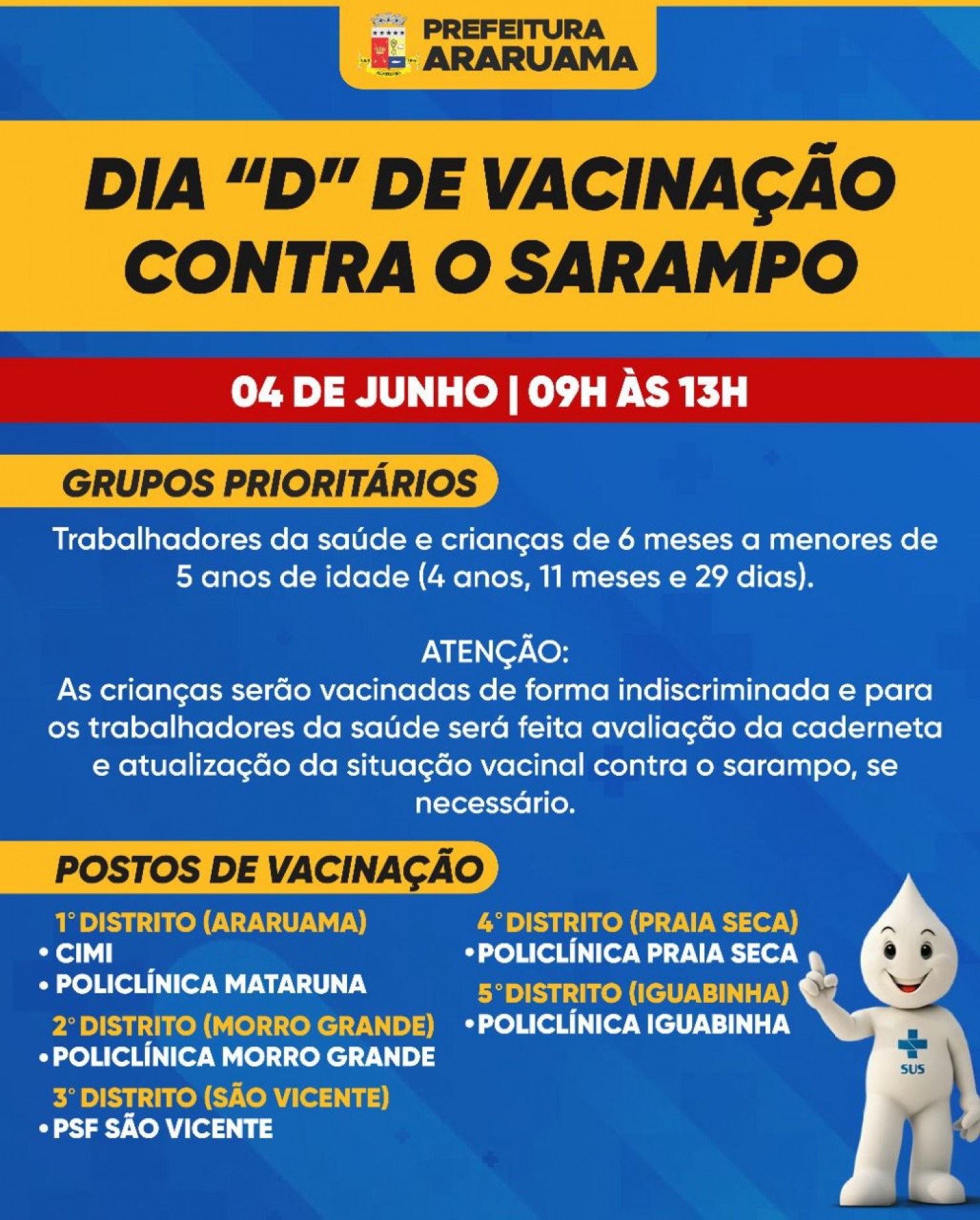 A imunização vai acontecer das 09h às 13h, nos seguintes postos: