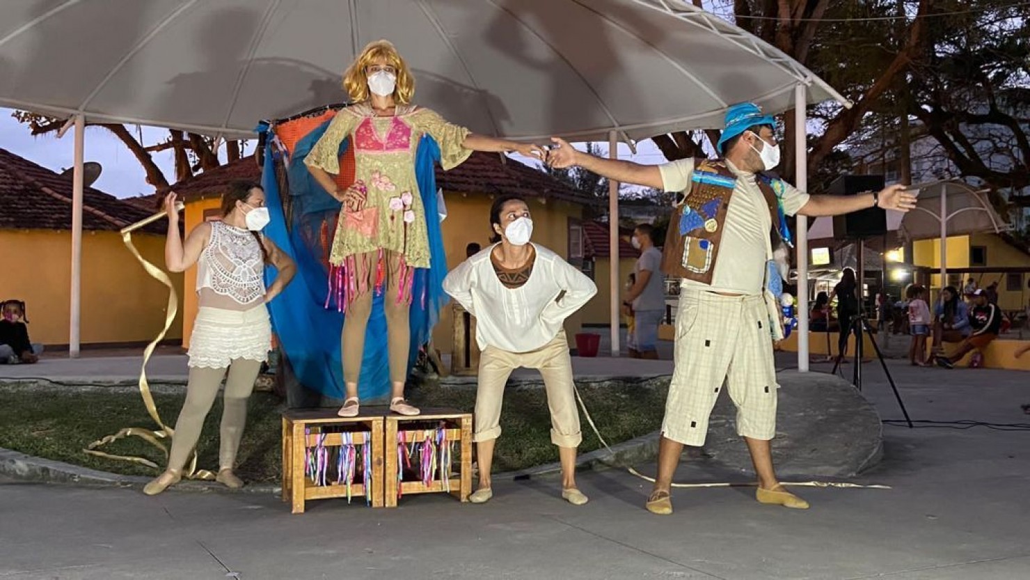 Os artistas do grupo Teatrama se apresentaram com máscaras de proteção e encantaram o público presente.