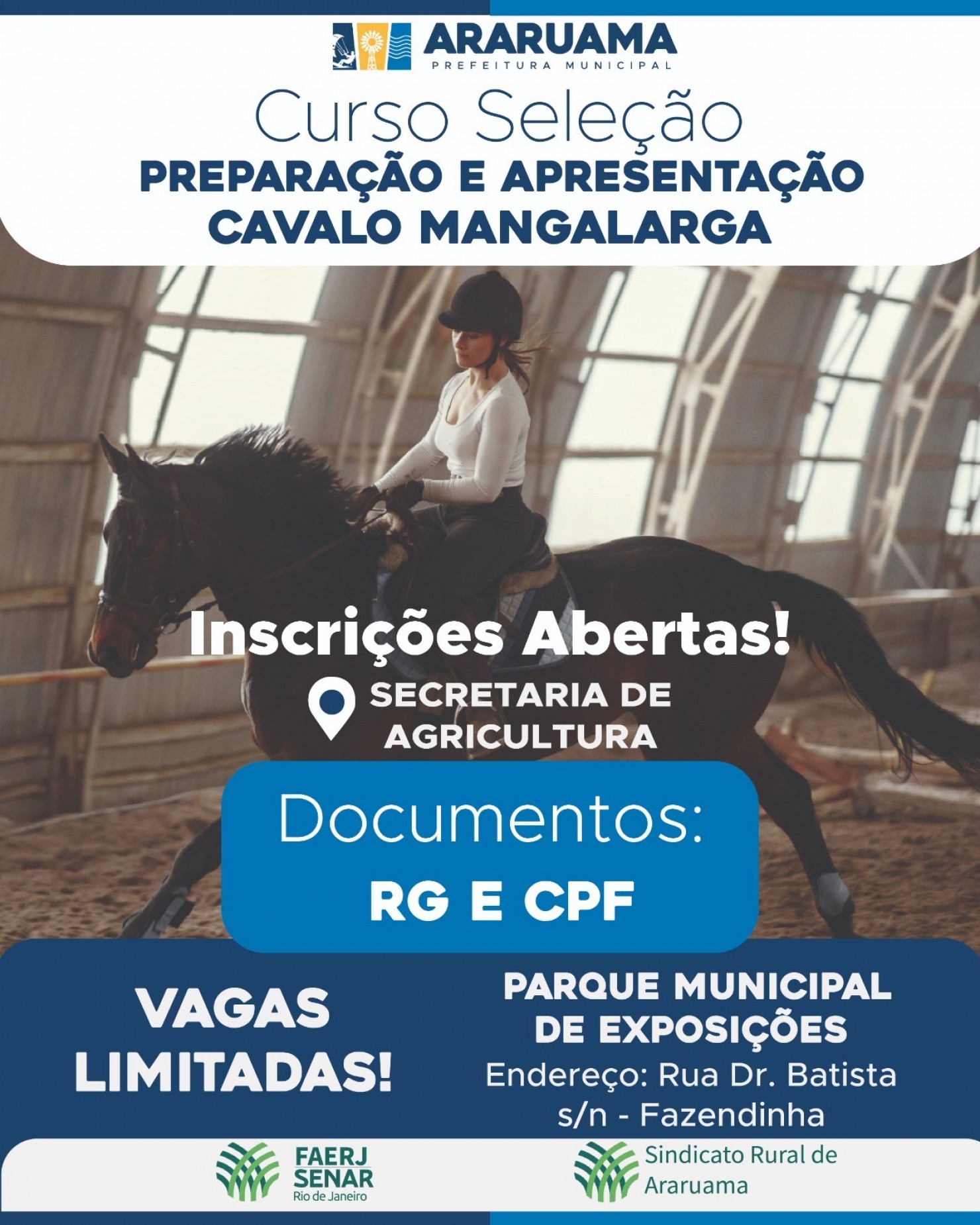 A Prefeitura de Araruama, por meio da Secretaria Municipal de Agricultura, está com inscrições abertas para o curso de preparação e apresentação do cavalo Mangalarga Marchador, uma das raças mais admiradas e tradicionais do país.