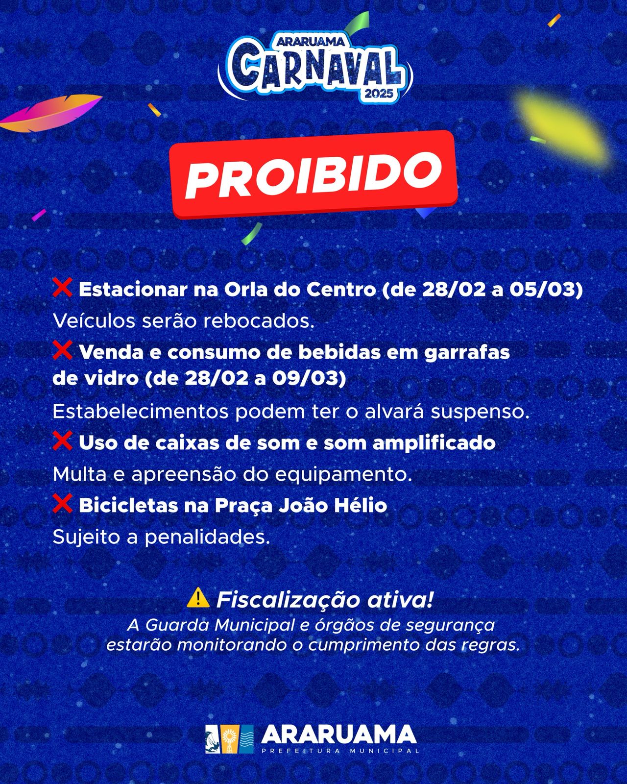 Também não será permitida a utilização de caixas de som e som amplificado nos locais onde ocorrerão as festividades do Carnaval durante o mesmo período.