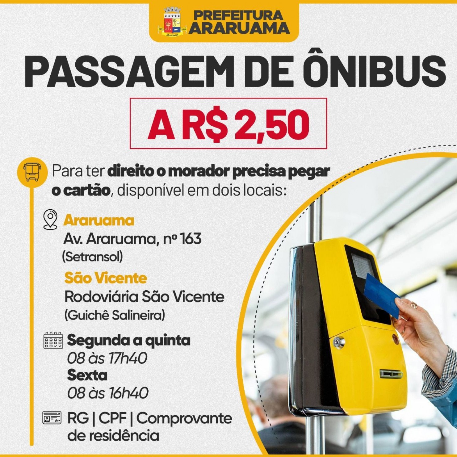 Para continuar tendo acesso a esse valor os moradores têm o prazo de 10 dias para adquirir o cartão "Araruama Tarifa Social", pois após esse período a passagem será no valor de R$ 2,50 apenas para quem adquiri-lo nos seguintes locais: