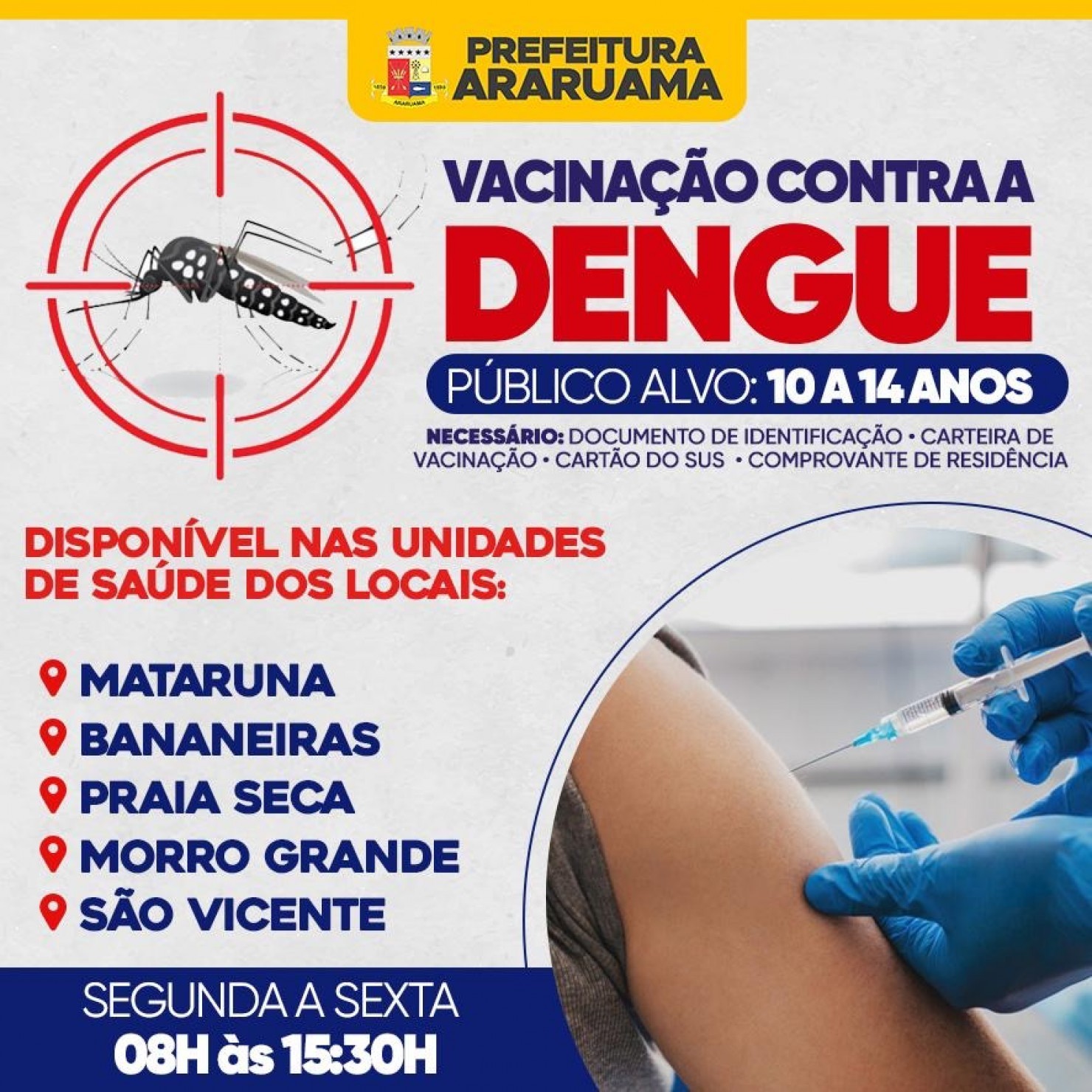 É preciso levar RG, carteira de vacinação, cartão do Sus e comprovante de endereço.