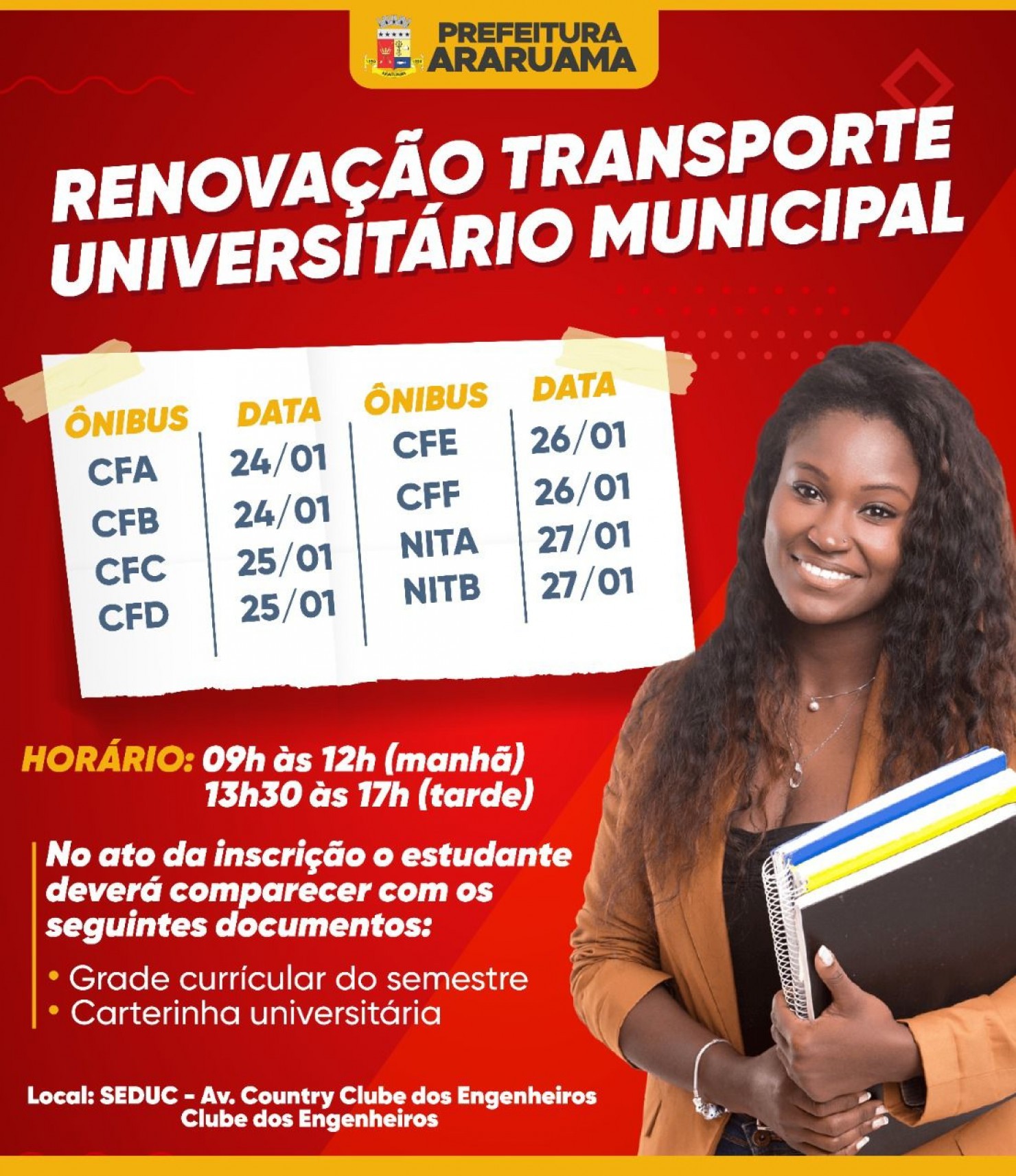 A renovação vai acontecer entre os dias 24 e 27 de janeiro , das 09h às 12h e de 13h30 às 17h, presencialmente na sede da Secretaria de Educação, que fica na Avenida Country Clube dos Engenheiros, no bairro Clube dos Engenheiros.