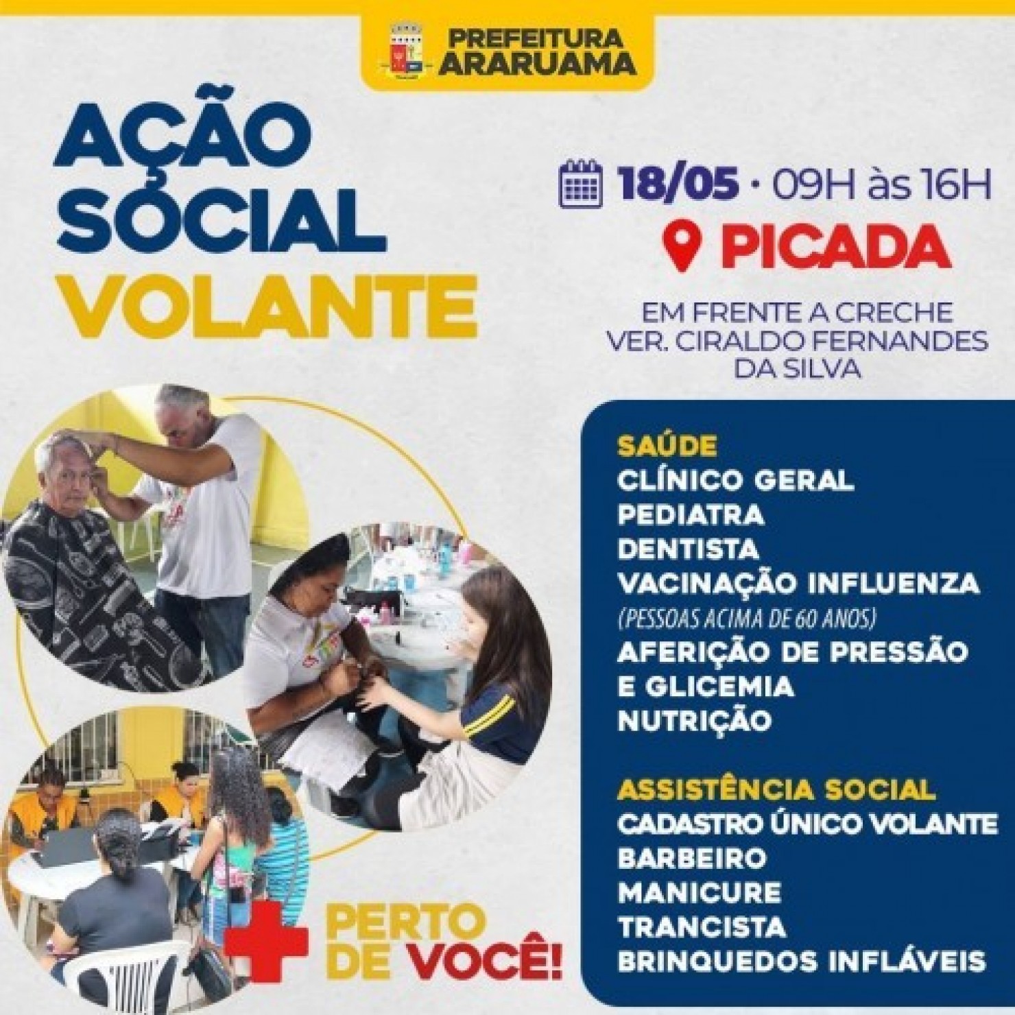 Serão disponibilizados aos moradores atendimentos na área da saúde, com o médico clínico geral, dr. Paulo de Tarso e a pediatra, dra. Viviane Lobo; além de dentista móvel, aferição de pressão, medição de glicemia, nutrição e vacinação contra a gripe.