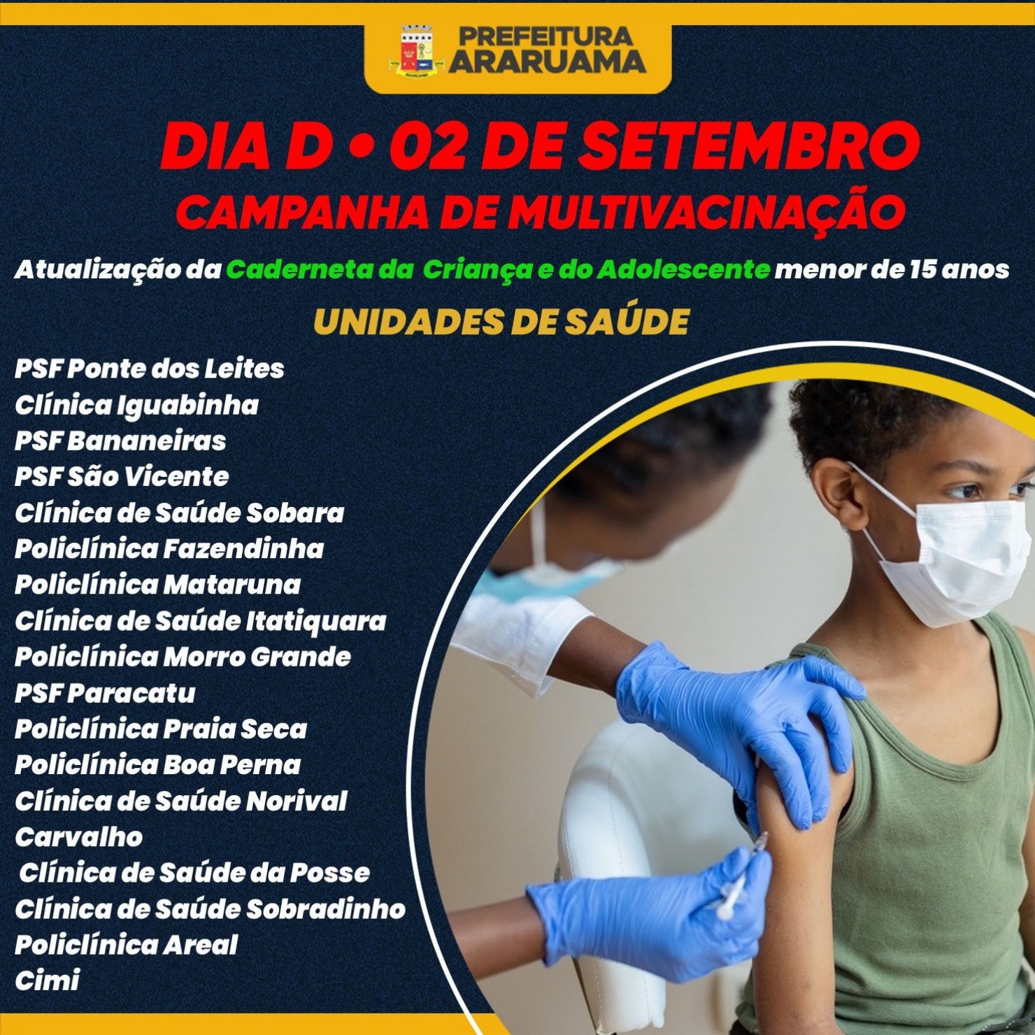 Atenção pais e responsáveis: A Prefeitura de Araruama, por meio da Secretaria de Saúde, vai realizar amanhã, 02 de setembro, o “Dia D” da Campanha de Multivacinação para atualização da caderneta de vacinação da criança e do adolescente menor de 15 anos.