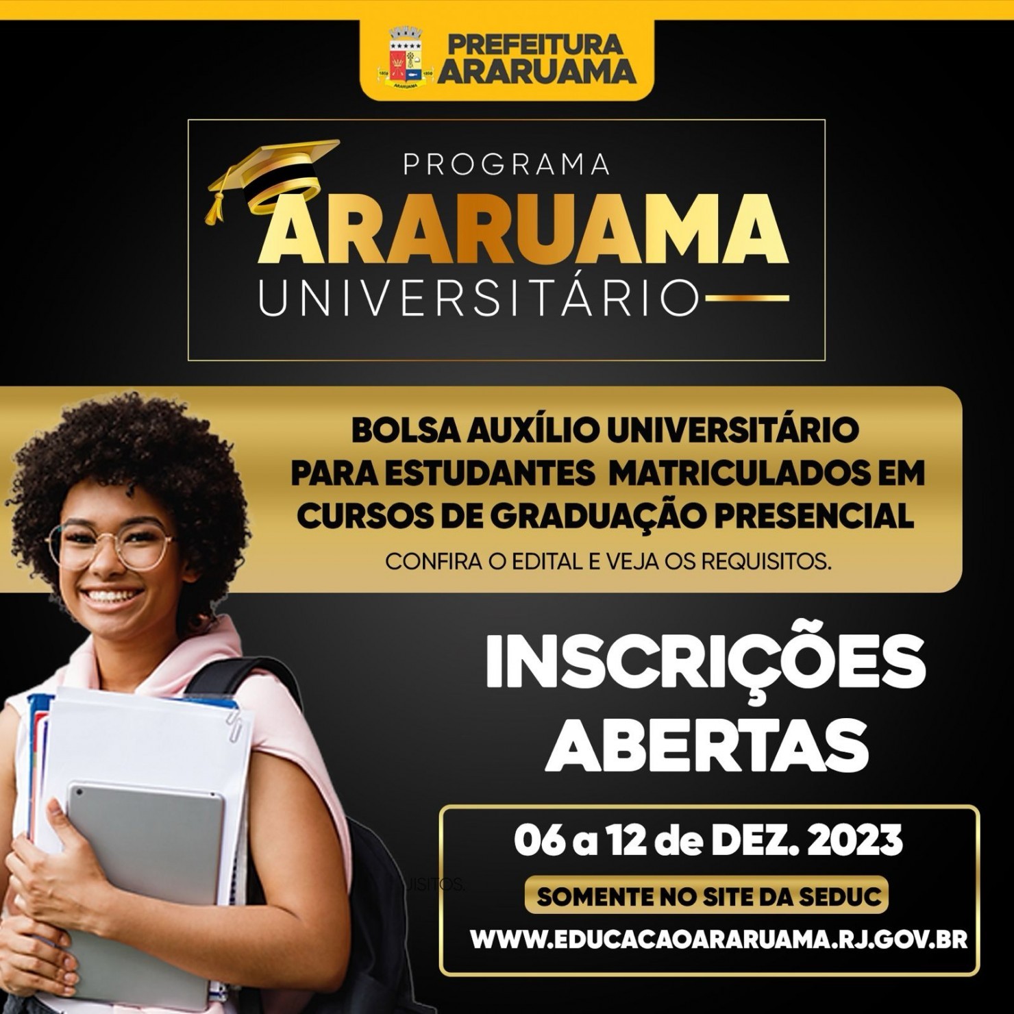 Entre os critérios exigidos, o aluno deve residir no município de Araruama por no mínimo 5 anos, não possuir benefício semelhante e a renda familiar não pode passar de 6 salários mínimos mensais.
