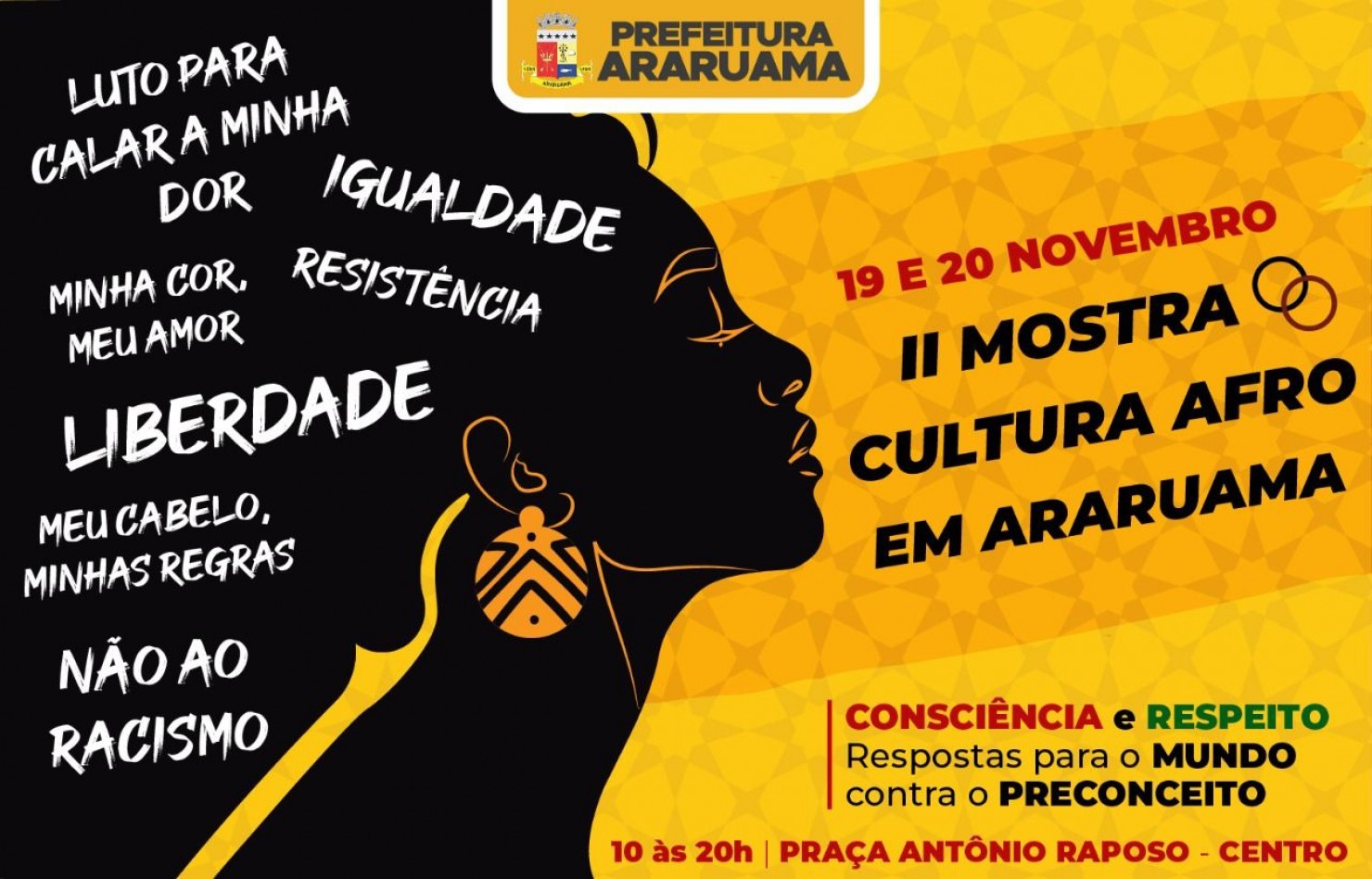 No dia 19 vai acontecer a palestra de abertura: “Consciência Negra- Ato de Resistência”, seguida de apresentação cultural escolar, contação de histórias, oficina de bonecas Abayoni, roda de capoeira, dança afro e show musical.