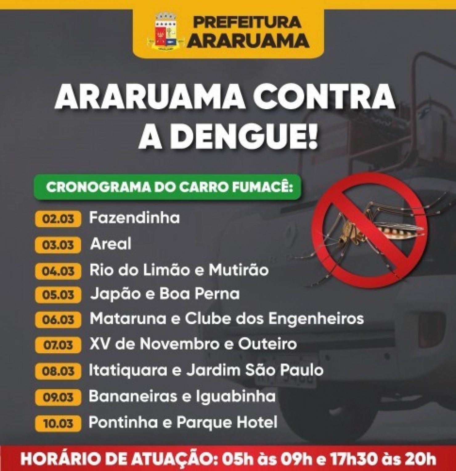 E atenção : a Prefeitura, por meio da Vigilância Epidemiológica, montou um cronograma com os nomes dos bairros e os horários onde o fumacê vai passar. Esse cronograma será divulgado semanalmente nas páginas das redes sociais da Prefeitura e no site. Assim, você, morador, vai poder conferir sempre se seu bairro será contemplado e em qual dia.