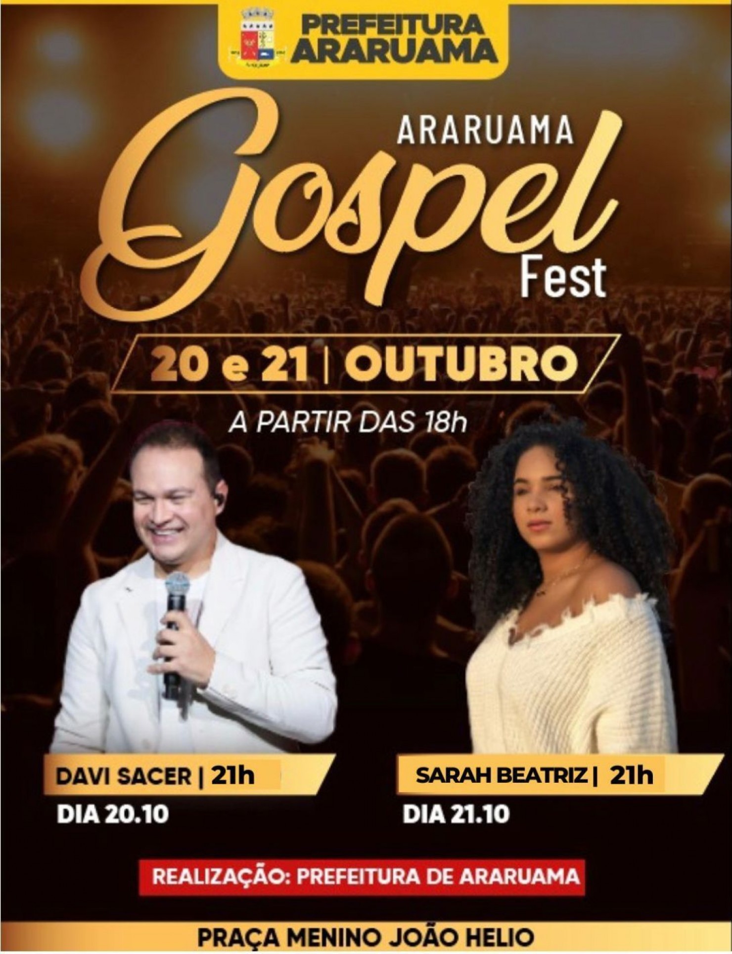 O evento de música gospel (que é um estilo musical religioso de grupos cristãos) vai acontecer nos dias 20 e 21 de outubro, a partir das 18h, na Praça Menino João Hélio, no Centro.