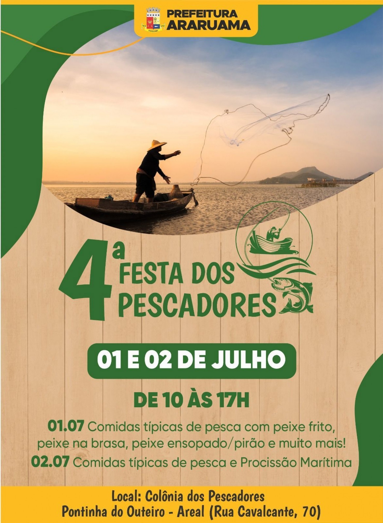 O evento vai acontecer nos dias 01 e 02 de julho, na sede da Colônia dos Pescadores Z-28, localizada na Rua Cavalcante, nº 70, no bairro Pontinha do Outeiro (Rancho dos Pescadores), das 10h às 17h.