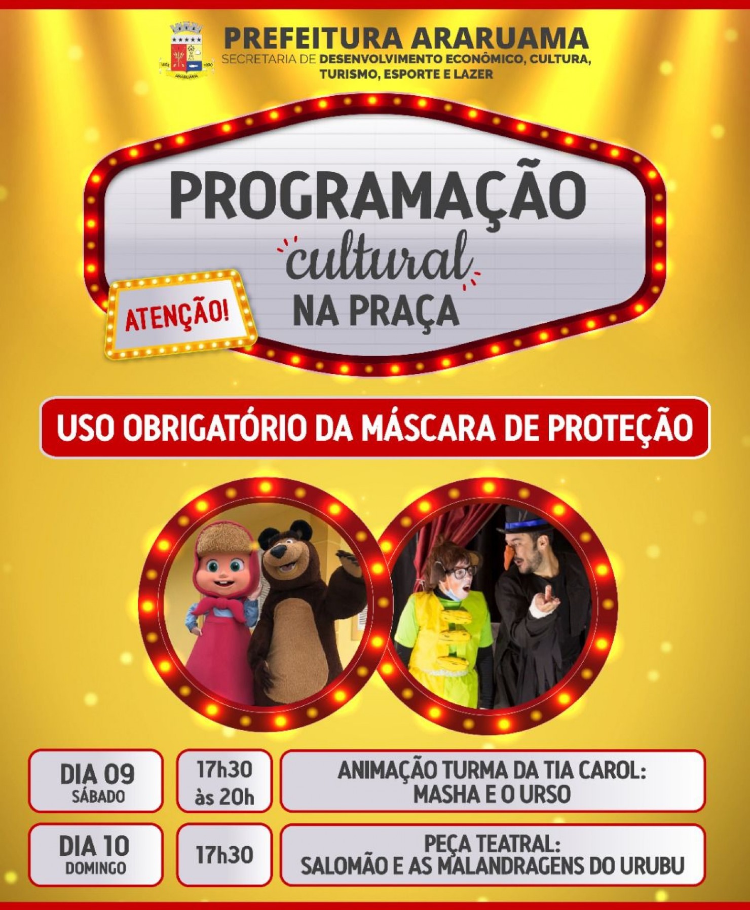 O projeto “Programação Cultural na Praça” vai animar o público infantil nesse fim de semana , mantendo todos os protocolos de higienização e segurança contra a Covid-19.