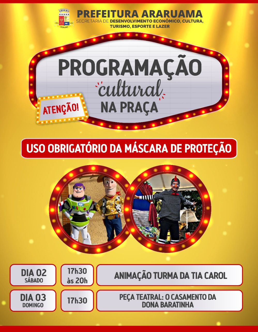 Importante ressaltar que no local será obrigatório o uso de máscara de proteção e distanciamento social.