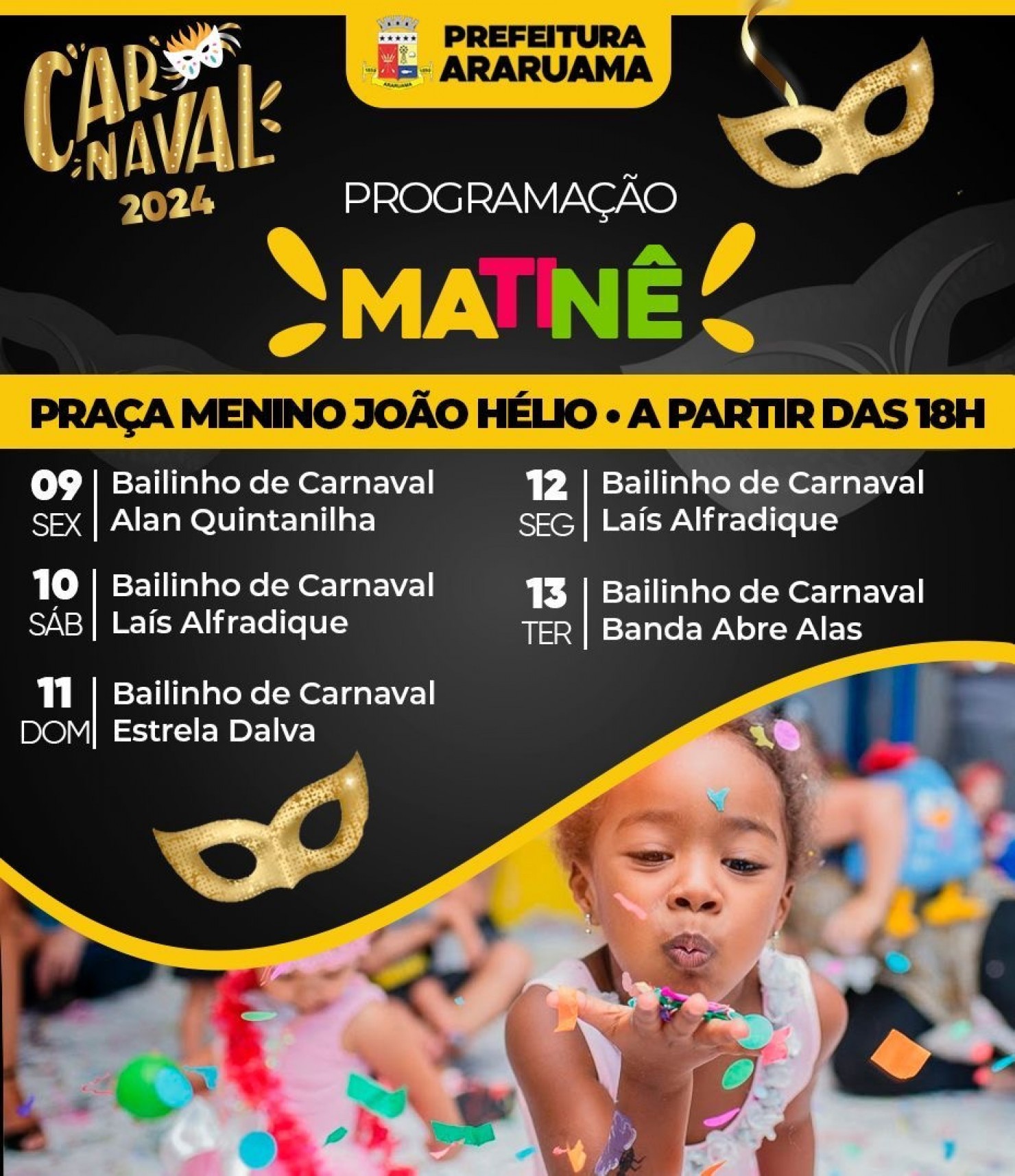 Todos os dias haverá matinês, com apresentação de Djs das 18h às 20h30; e shows para as crianças com a turma da tia Carol das 18h às 20h; é o Bailinho, que vai mexer com a fantasia dos nossos pequenos.