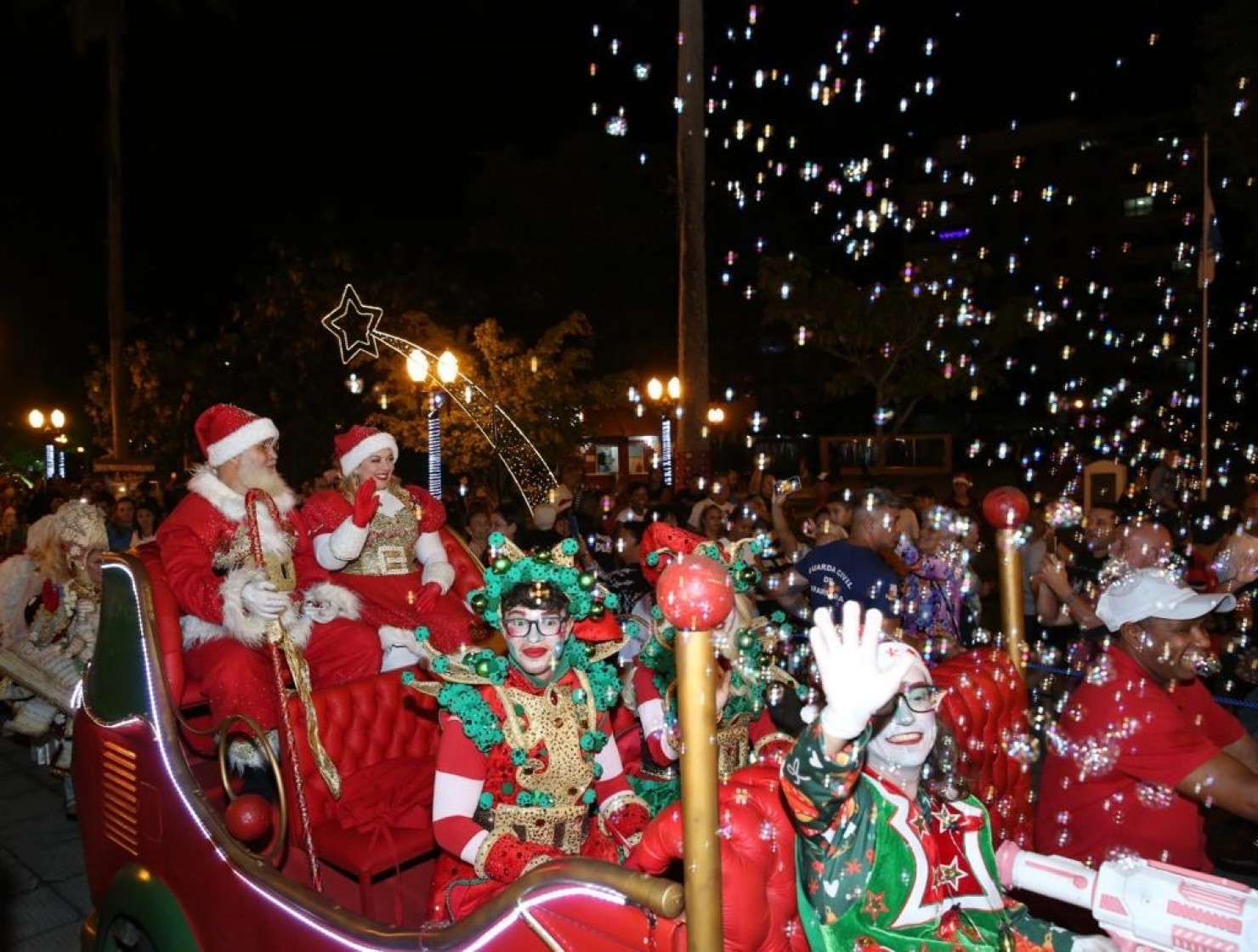 Mas o grande momento foi mesmo a entrada triunfal do nosso bom velhinho. Os olhinhos das crianças brilharam ao ver Papai e Mamãe Noel chegando em um carro aberto. Eles desfilaram por toda a praça, por onde também passaram personagens natalinos, crianças fantasiadas e a nossa turma da Terceira Idade.